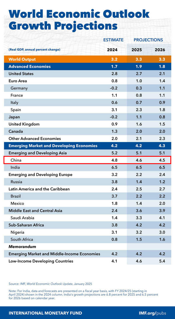 具体来看,发达经济体今年预计将增长1.9%,明年预计将增长1.8%。美国和欧元区经济预计今年将分别增长2.7%和1.0%,明年将分别增长2.1%和1.4%。新兴市场和发展中经济体今年预计将增长4.2%,明年将增长4.3%。中国经济预计今年将增长4.6%,较去年10月预测值高出0.1个百分点;明年预计增长4.5%。