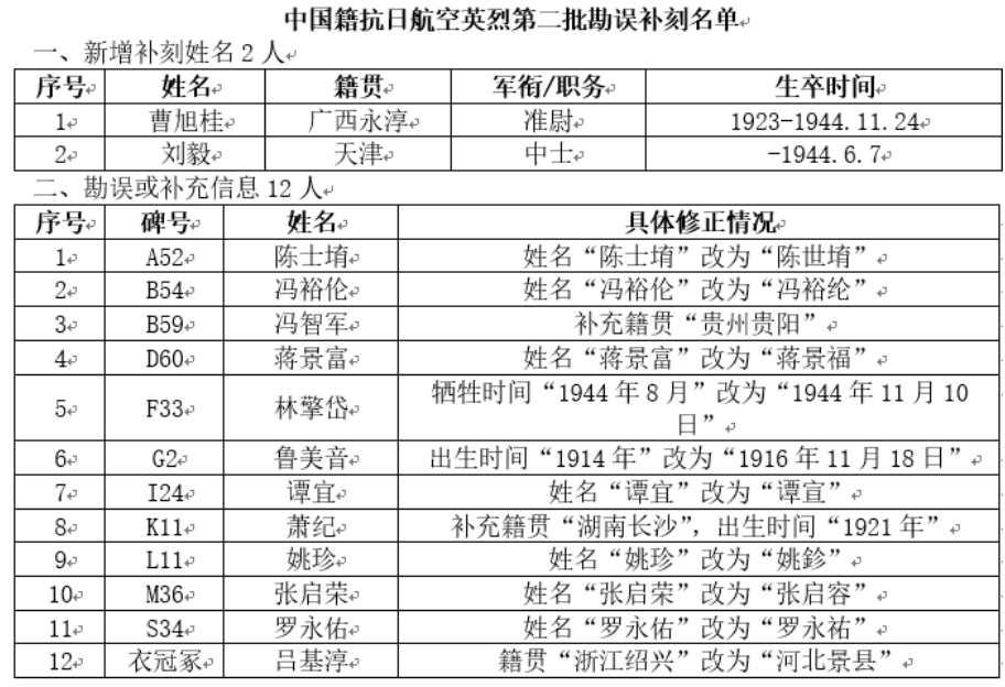 此次新增的2位英烈的姓名为曹旭桂和刘毅。“我们接到了英烈曹旭桂亲属的补刻申请,英烈刘毅的信息则是由一位热心市民提供。经过多方资料核实和论证后,均符合补刻条件。”南京抗日航空烈士纪念馆工作人员窦若琪说。
