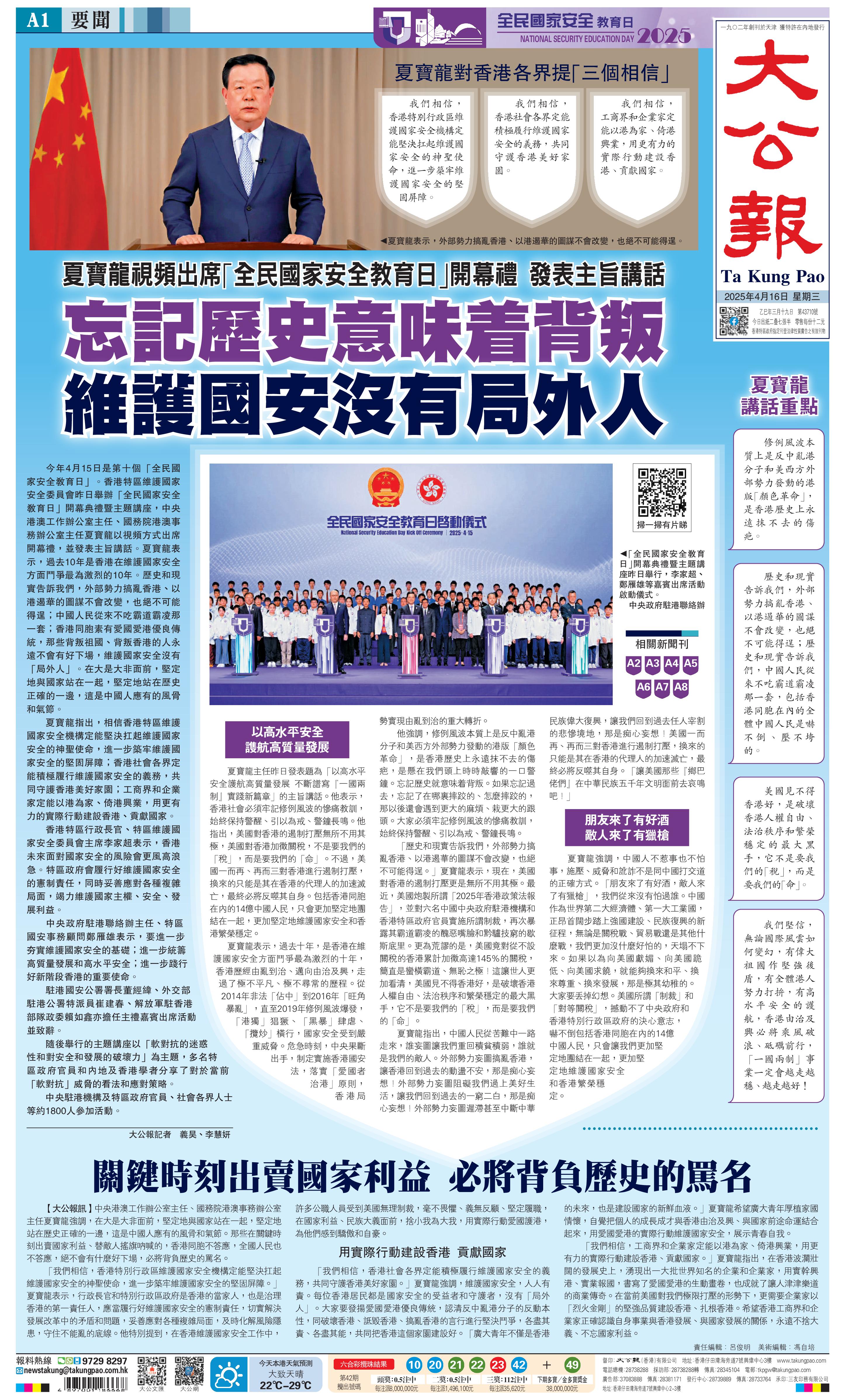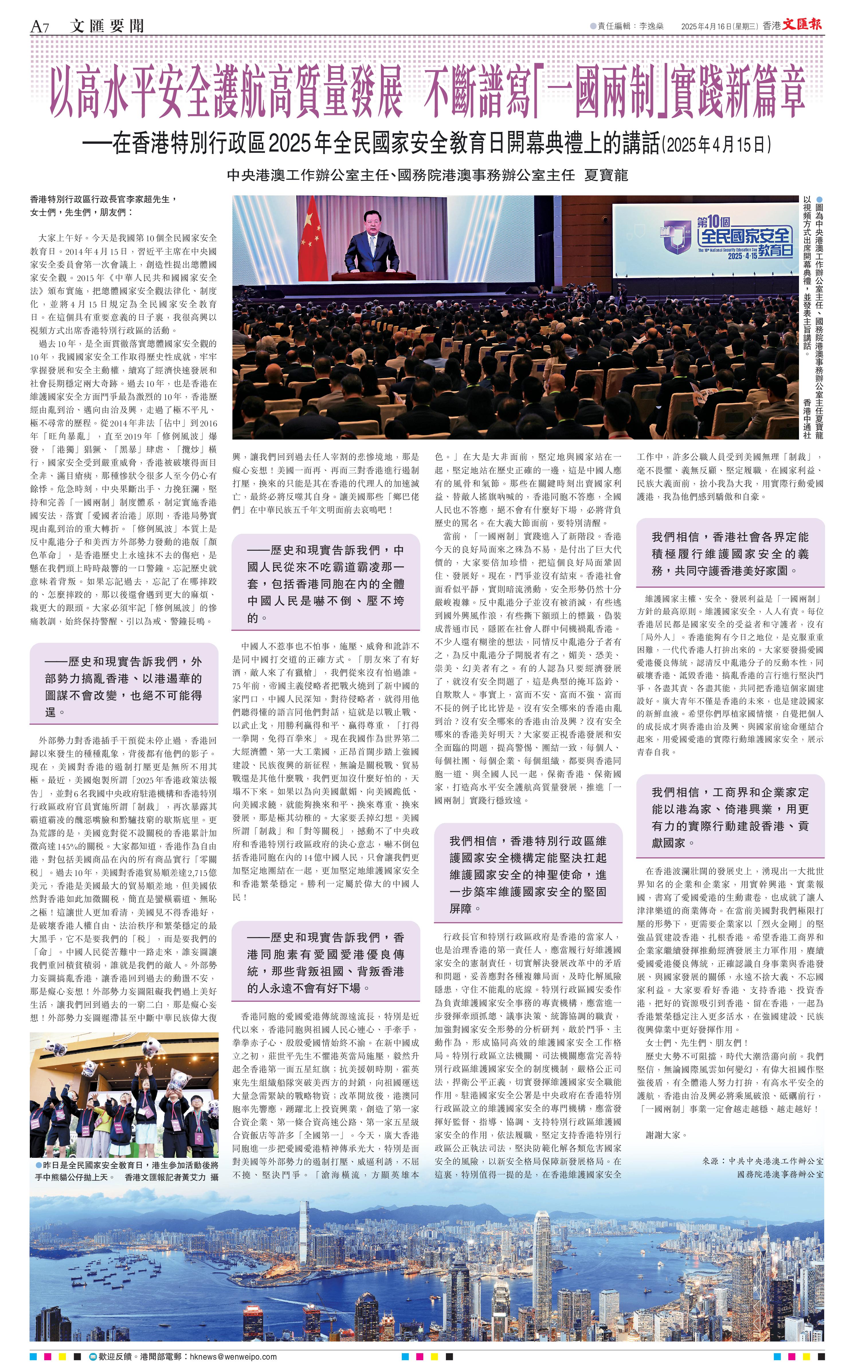 「我们相信,香港社会各界定能积极履行维护国家安全的义务,共同守护香港美好家园。」夏宝龙强调,维护国家安全,人人有责。每位香港居民都是国家安全的受益者和守护者,没有「局外人」。大家要发扬爱国爱港优良传统,认清反中乱港分子的反动本性,同破坏香港、诋毁香港、搞乱香港的言行进行坚决斗争,各尽其责、各尽其能,共同把香港这个家园建设好。 「广大青年不仅是香港的未来,也是建设国家的新鲜血液。」夏宝龙希望广大青年厚植家国情怀,自觉把个人的成长成才与香港由治及兴、与国家前途命运结合起来,用爱国爱港的实际行动维护国家安全,展示青春自我。
