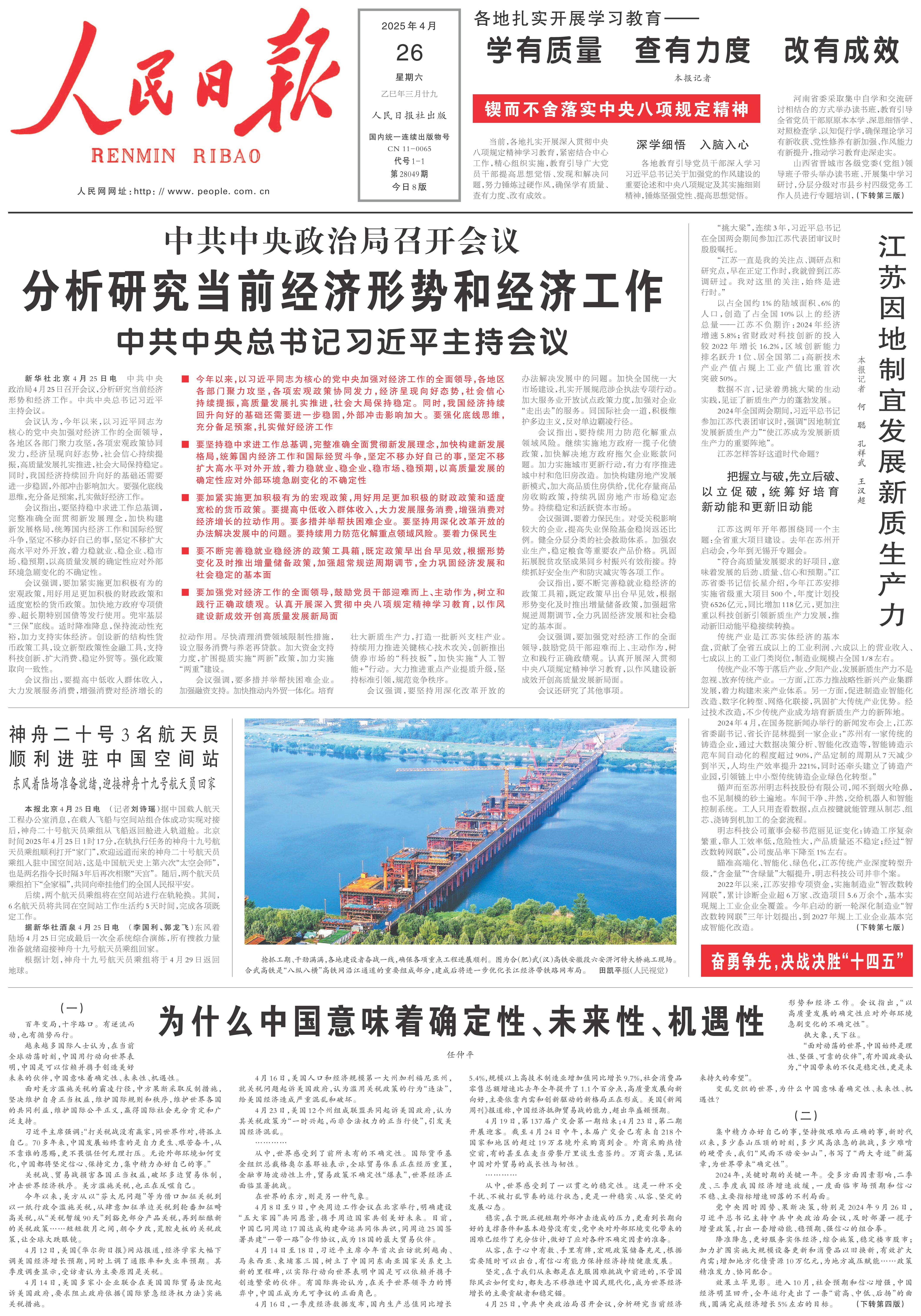 4月25日,中共中央政治局召开会议,分析研究当前经济形势和经济工作。会议指出,“以高质量发展的确定性应对外部环境急剧变化的不确定性”。