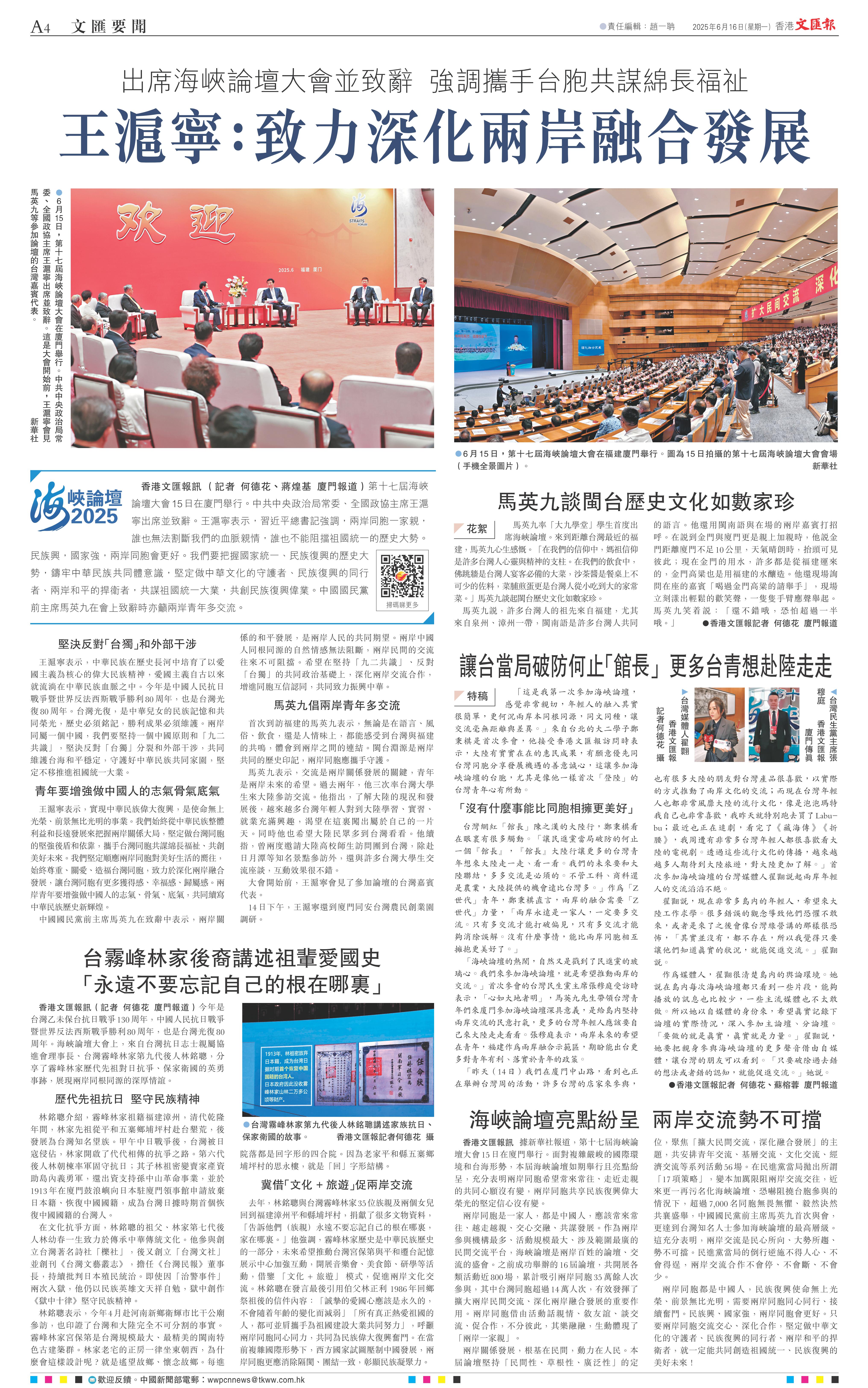 新华社厦门6月15日电 第十七届海峡论坛大会15日在厦门举行。中共中央政治局常委、全国政协主席王沪宁出席并致辞。