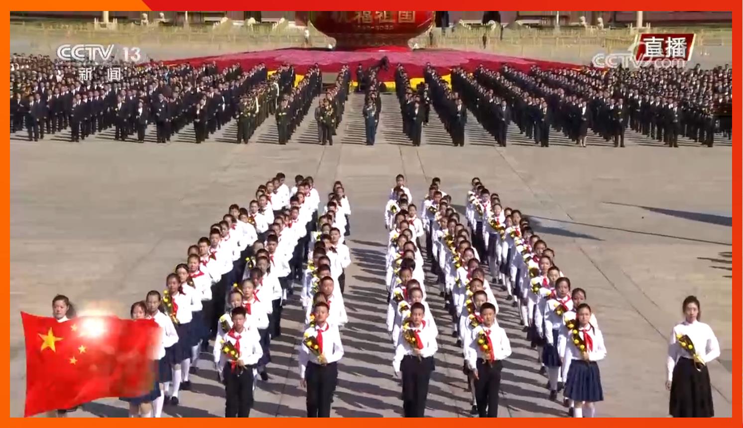 默哀毕,手持鲜花的少年儿童面向人民英雄纪念碑高唱《我们是共产主义接班人》,并致少年先锋队队礼。