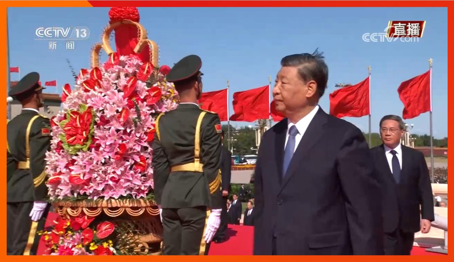 习近平等党和国家领导人缓步登上纪念碑基座,在花篮前驻足凝视。盛放的百合、鲜艳的红掌、芬芳的文心兰,寄托着对人民英雄的深切缅怀和崇高敬意。