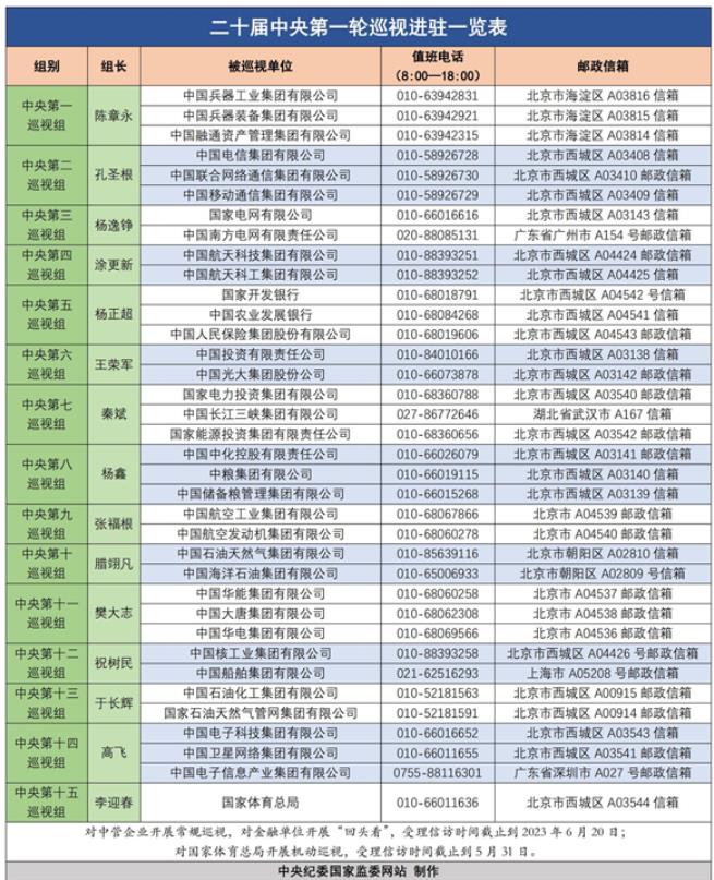 新华社北京10月10日电 经党中央批准,二十届中央第二轮巡视将对科学技术部、工业和信息化部、国务院国有资产监督管理委员会、国家国防科技工业局、国家烟草专卖局和中国第一汽车集团有限公司、东风汽车集团有限公司、中国一重集团有限公司、中国机械工业集团有限公司、哈尔滨电气集团有限公司、中国东方电气集团有限公司、鞍钢集团有限公司、中国宝武钢铁集团有限公司、中国矿产资源集团有限公司、中国铝业集团有限公司、中国远洋海运集团有限公司、中国航空集团有限公司、中国东方航空集团有限公司、中国南方航空集团有限公司、中国五矿集团有限公司、中国通用技术(集团)控股有限责任公司、中国建筑集团有限公司、中国南水北调集团有限公司、国家开发投资集团有限公司、招商局集团有限公司、华润(集团)有限公司、中国旅游集团有限公司、中国商用飞机有限责任公司、中国邮政集团有限公司、中国出版集团有限公司、紫荆文化集团有限公司等31家单位党委(党组)开展常规巡视;对国家铁路局党组、中国国家铁路集团有限公司党组开展巡视“回头看”。