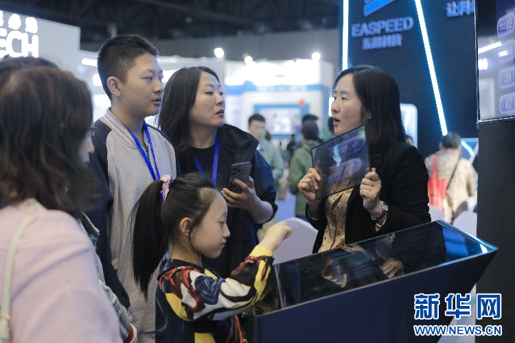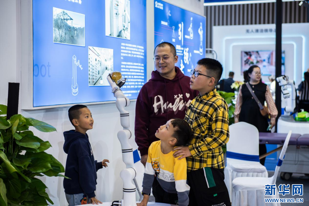 展会上的智能设备吸引孩子们围观。新华网 发(王昕妍 摄)