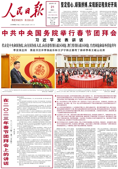 中共中央、国务院20日上午在人民大会堂举行2023年春节团拜会。中共中央总书记、国家主席、中央军委主席习近平发表讲话,代表党中央和国务院,向全国各族人民,向香港特别行政区同胞、澳门特别行政区同胞、台湾同胞和海外侨胞拜年。春节前夕,习近平通过视频连线看望慰问基层干部群众,向全国各族人民致以新春的美好祝福,祝各族人民幸福安康,祝愿伟大祖国繁荣昌盛。