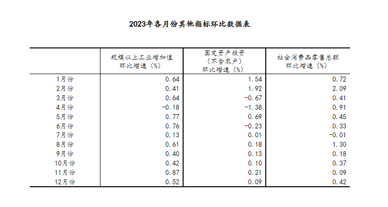 (2)根据季节调整模型自动修正结果,对近一年来各期国内生产总值、规模以上工业增加值、固定资产投资(不含农户)、社会消费品零售总额环比增速进行修订。修订结果及2023年四季度GDP环比数据、2023年12月份其他指标环比数据如下: