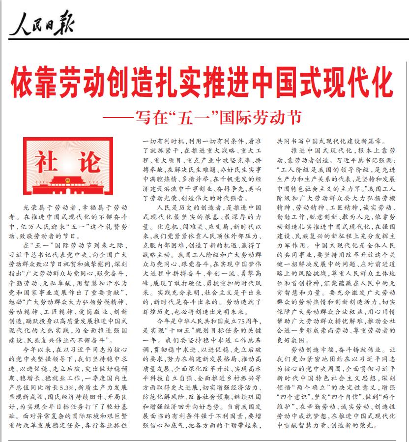 在“五一”国际劳动节到来之际,习近平总书记代表党中央,向全国广大劳动群众致以节日祝贺和诚挚慰问,深刻指出“广大劳动群众与党同心、跟党奋斗,辛勤劳动、无私奉献,用智慧和汗水为党和国家事业发展作出了重要贡献”,勉励“广大劳动群众大力弘扬劳模精神、劳动精神、工匠精神,爱岗敬业、创新创造,踊跃投身以高质量发展推进中国式现代化的火热实践,为全面推进强国建设、民族复兴伟业而不懈奋斗”。