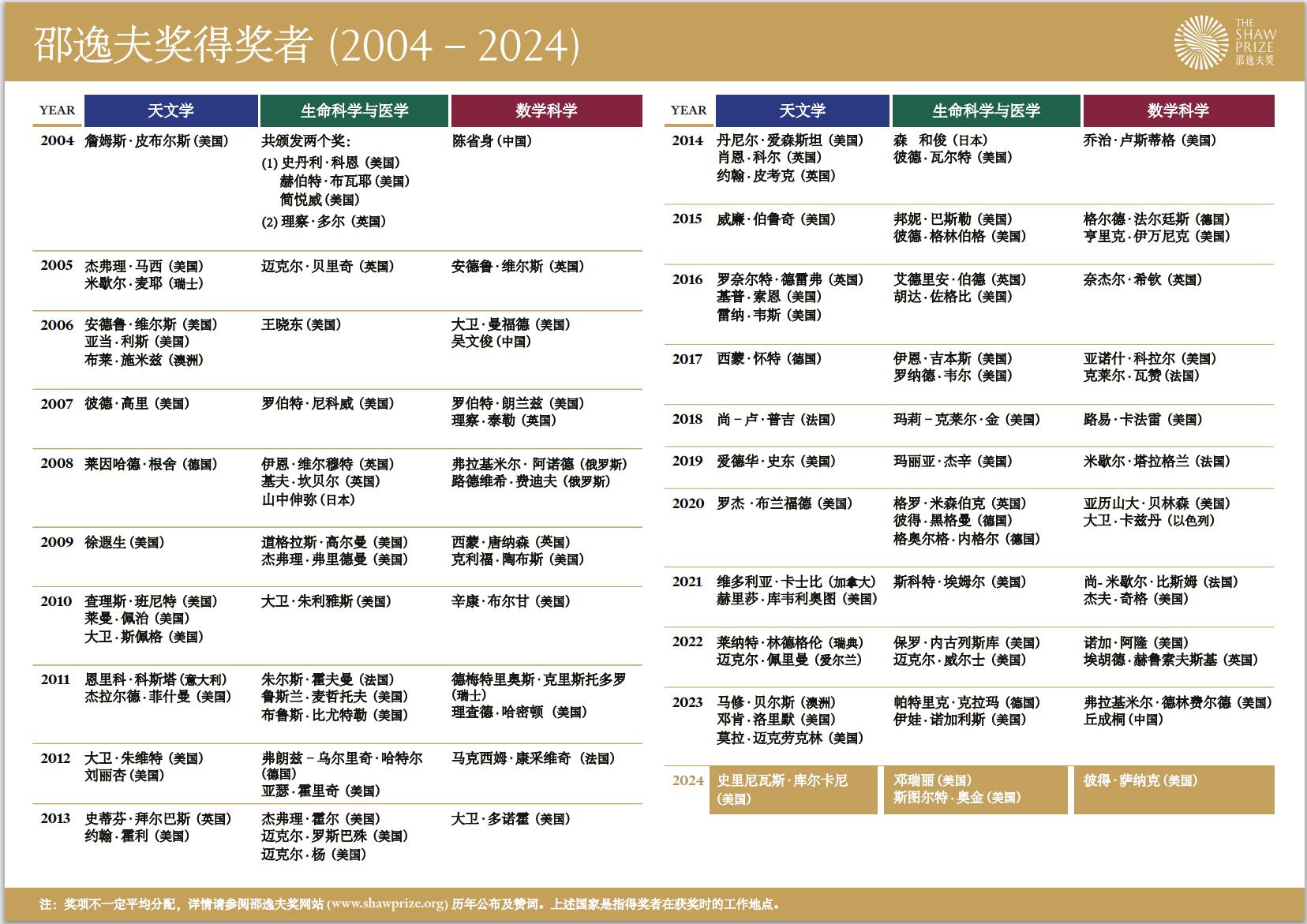 新华社香港5月21日电(记者谢妞)邵逸夫奖基金会21日在香港公布2024年度邵逸夫奖获奖名单,4位科学家分获天文学、生命科学与医学、数学科学3个奖项,每项奖金120万美元。