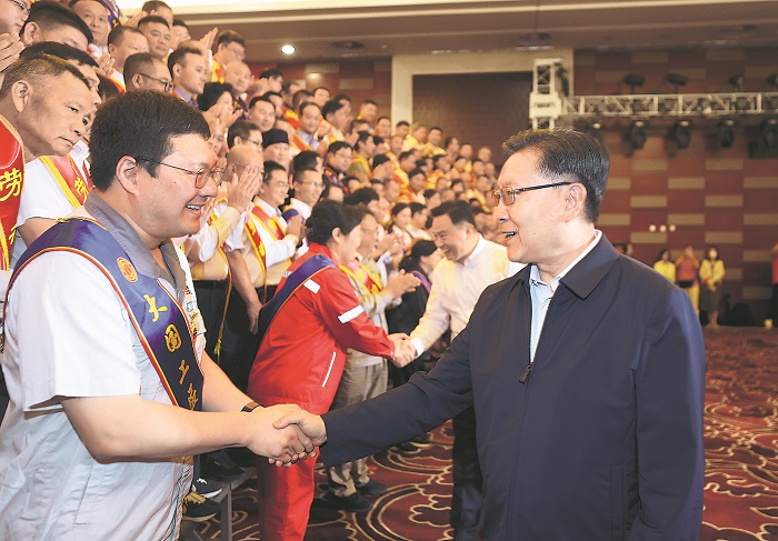 6月13日上午,2024年全国劳模疗休养活动在北京启动,全国人大常委会副委员长、中华全国总工会主席王东明看望首批参加劳模疗休养的200多名劳模工匠代表。本报记者 杨登峰 摄