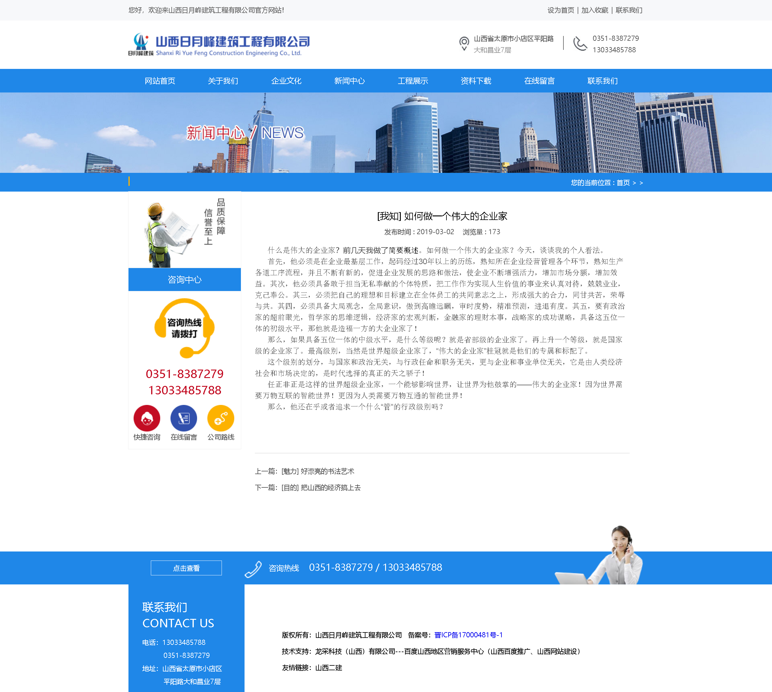 作为建筑企业,把建造人类美好幸福的家园,作为实现企业做大做强的发展战略,需要科技领先,技术先进,理念超前,服务周到,一流的质量,一流的信誉,一流的观念!