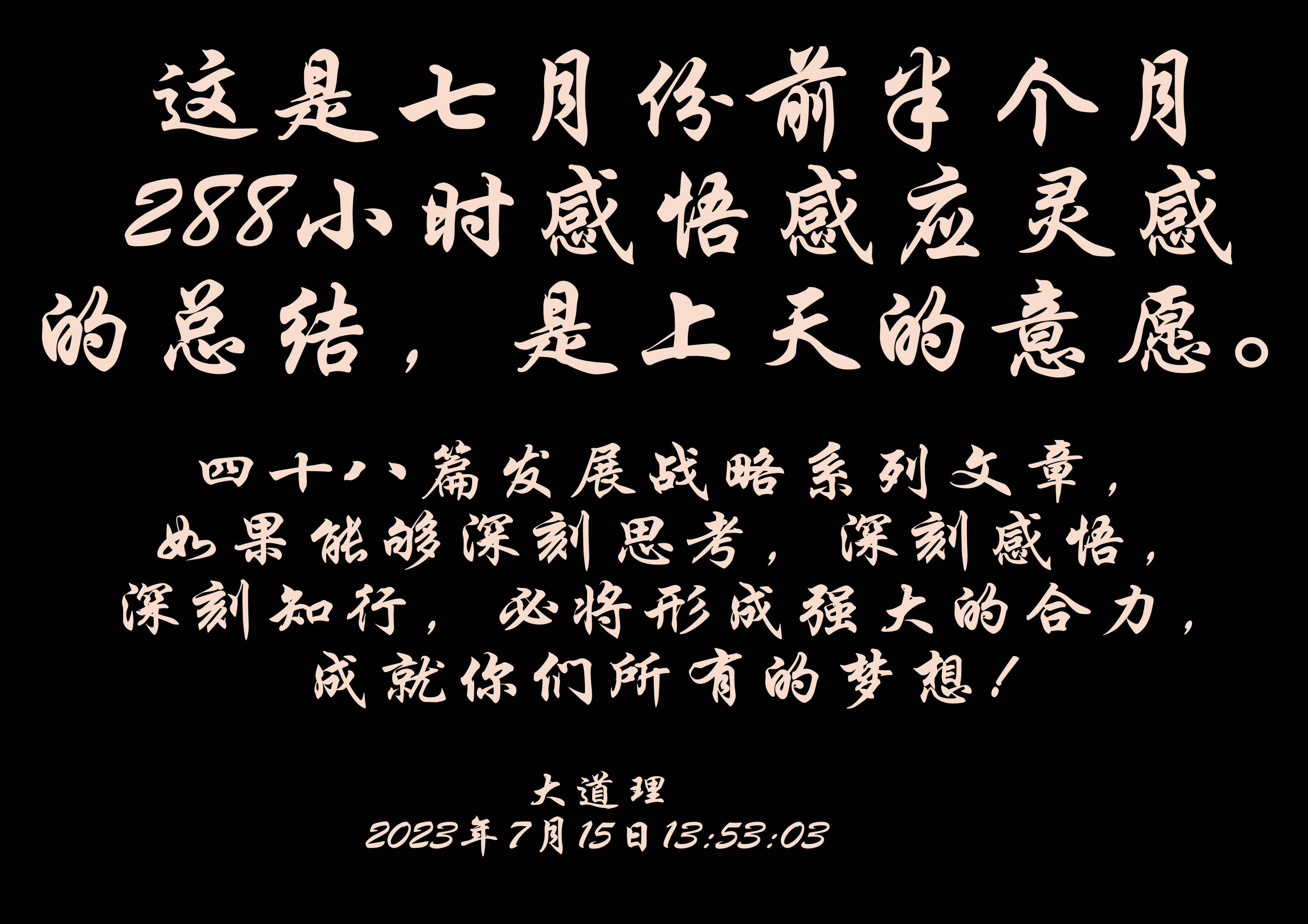 这是七月份前半个月288小时感悟感应灵感的总结,是上天的意愿。四十八篇发展战略系列文章,如果能够深刻思考,深刻感悟,深刻知行,必将形成强大的合力,成就你们所有的梦想!