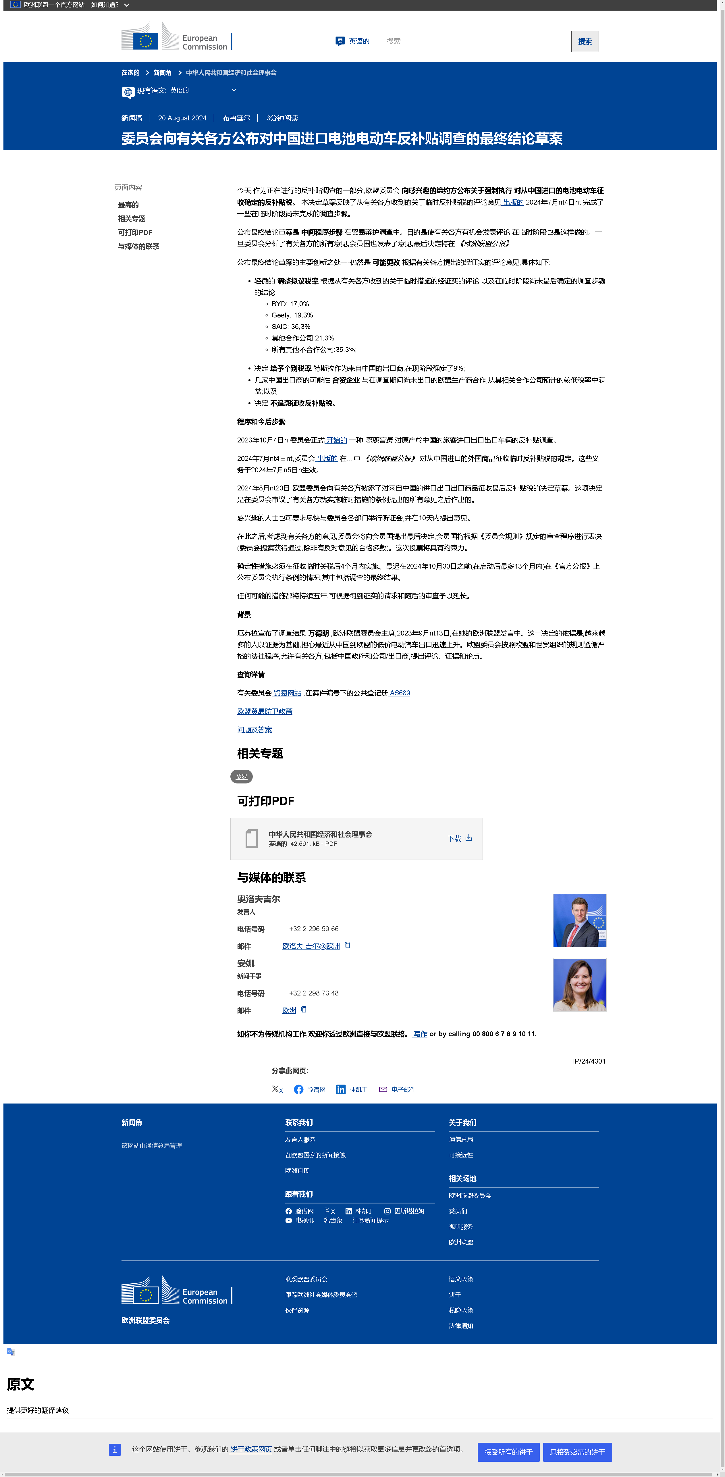 据悉,欧委会此次进行终裁披露后,将于11月4日前做出最终裁定。