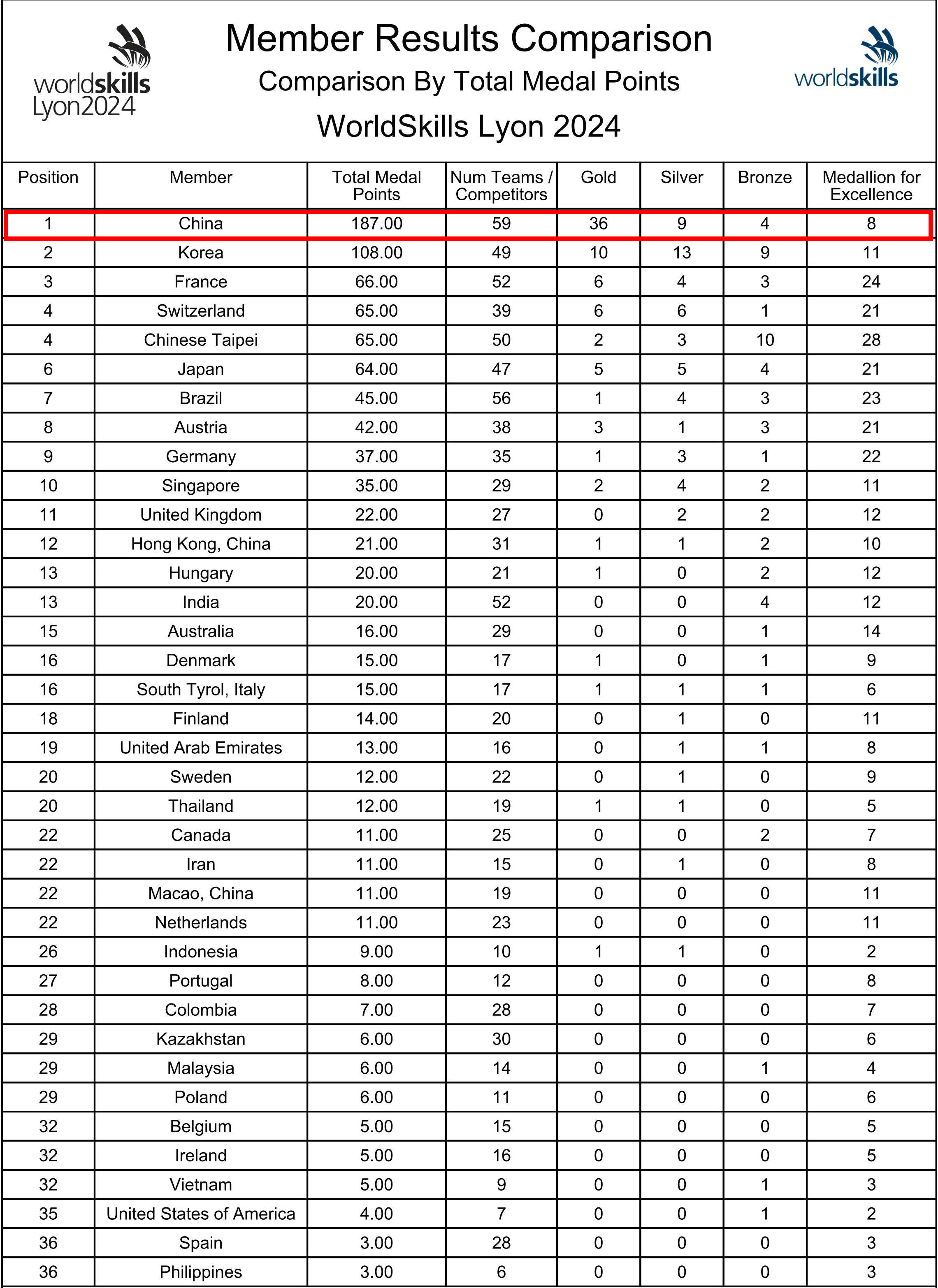 新华社法国里昂9月15日电 第47届世界技能大赛15日晚在法国里昂闭幕,中国代表团在本次大赛中表现出色,在全部59个项目中,共获得36枚金牌、9枚银牌、4枚铜牌和8个优胜奖,位居金牌榜、奖牌榜和团体总分首位。