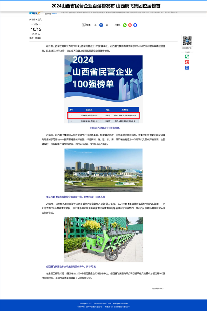 在全国工商联10月12日发布的“2024中国民营企业500强”榜单上,山西鹏飞集团有限公司以超千亿元的营收总额位居500强榜单第92位,是山西省首家营收超千亿的民营企业。
