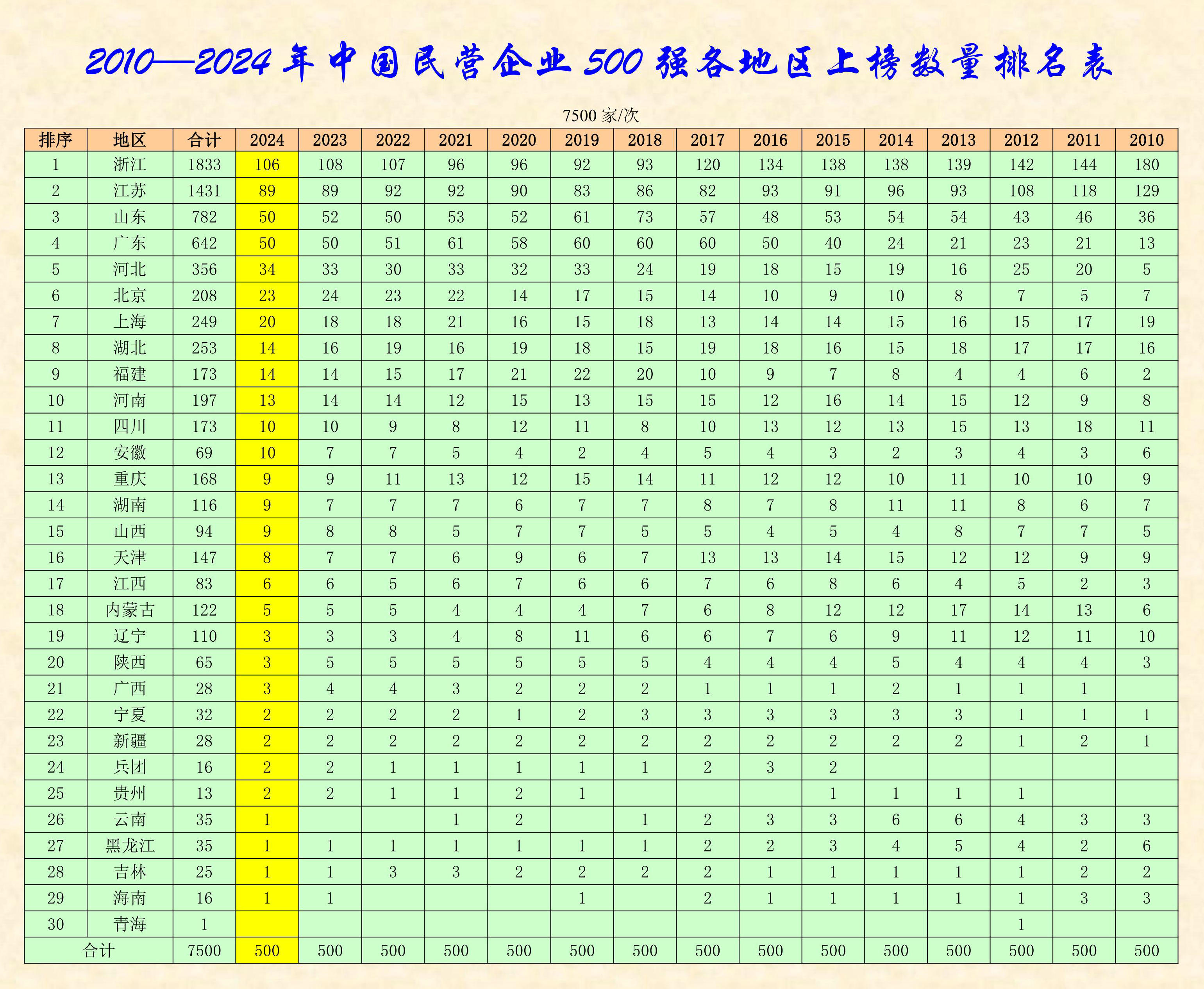 新华社杭州10月23日电(记者商意盈、魏一骏)全国工商联近期发布2024中国民营企业500强系列榜单,其中“中国民营企业500强”榜单中,浙江有106家企业入围,入围数连续26年位居全国首位。