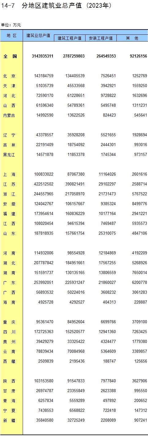 数据还显示,2024年全国建筑业总产值326501亿元,同比增长3.9%;全国建筑业房屋建筑施工面积136.8亿平方米,同比下降10.6%。与2023年建筑业相关数据相较,2024年建筑业总产值增长放缓,建筑业房屋建筑施工面积进一步下降。