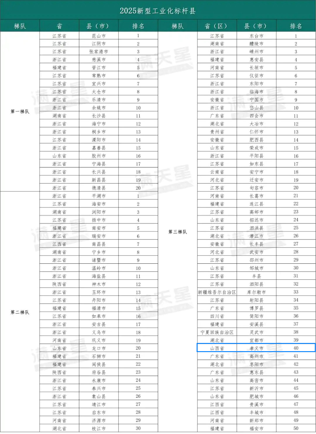 日前,赛迪方略县域经济研究中心发布了《2025新型工业化标杆县》名单,孝义市成功上榜,位列第三梯队第40位,成为我省唯一入选的县市。
