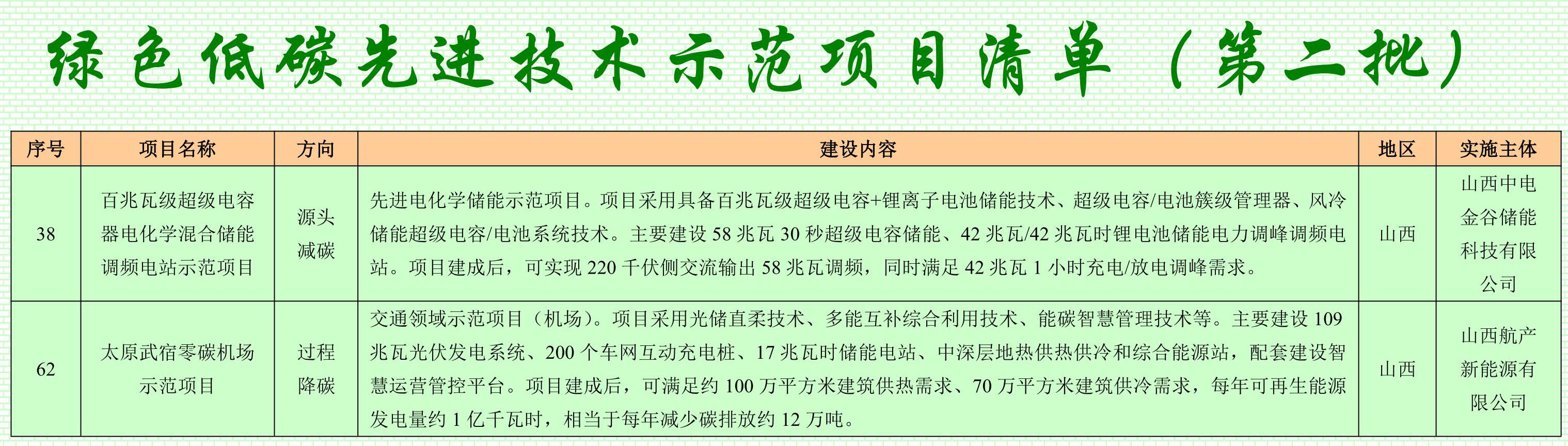 本报太原5月16日讯(记者王龙飞)近日,国家发展改革委正式公布《绿色低碳先进技术示范项目清单(第二批)》,我省有两个项目成功入选,分别是太原武宿零碳机场项目和中电金谷偏关混合储能调频电站项目。