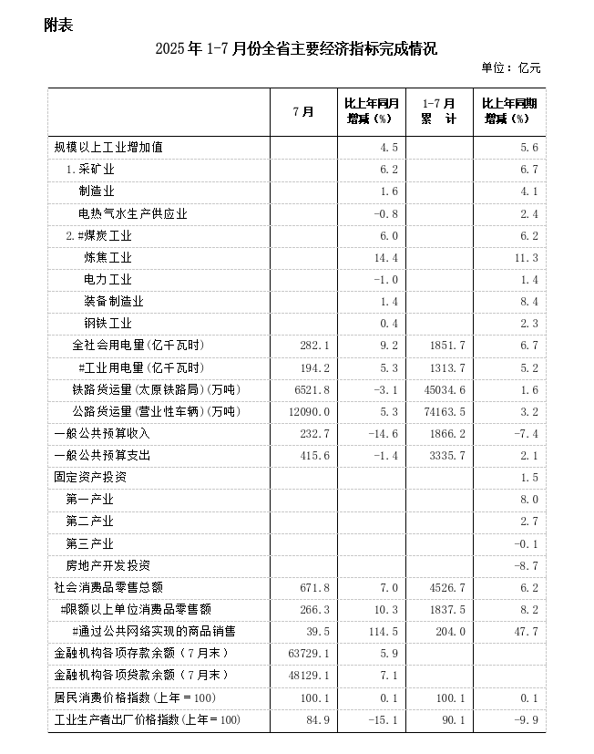 总的来看,在宏观政策持续发力显效和全省上下共同努力下,1-7月份全省经济运行顶住压力、平稳增长。同时也要看到,部分行业领域增速有所回落,下阶段经济延续稳定增长势头仍存压力。下一步,要深入学习贯彻习近平总书记考察山西重要讲话重要指示精神,按照省委十二届十次全会部署安排,坚定落实各项宏观政策,深入实施提振消费专项行动,扩围提质实施“两新”政策,积极扩大有效投资,高质量推动“两重”建设,奋力推动全省经济持续稳定运行、回升向好。