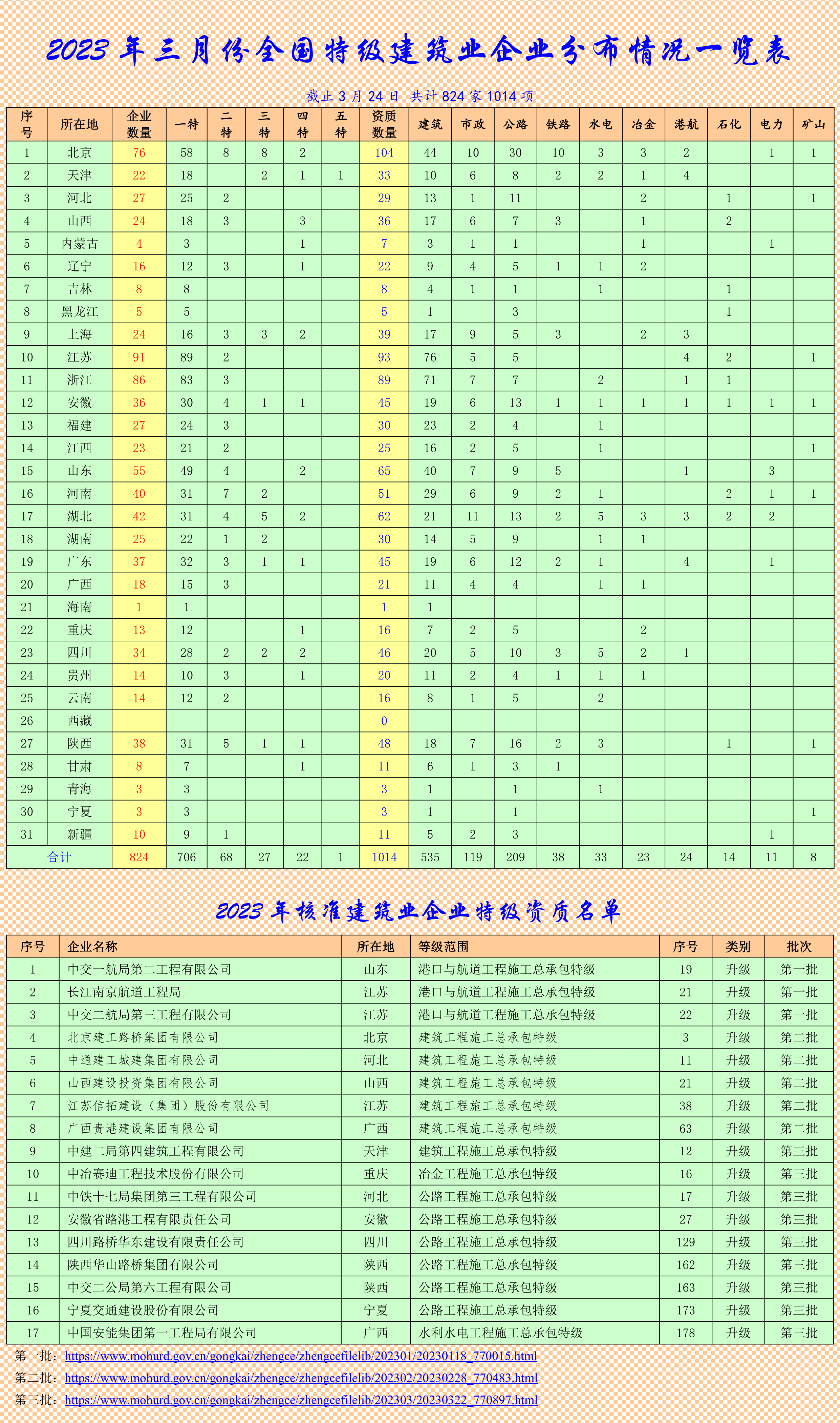 根据《中华人民共和国建筑法》及有关建设工程企业资质管理规定,现将我部核准的工程勘察资质、工程设计资质、建筑业企业资质、工程监理企业资质的单位名单(2023年度第三批)予以公布。未予核准的单位可登录住房和城乡建设部门户网站-政务服务平台,点击“办事服务”中“申请事项办理进度查询(受理发证信息查询)”栏目查询原因。
