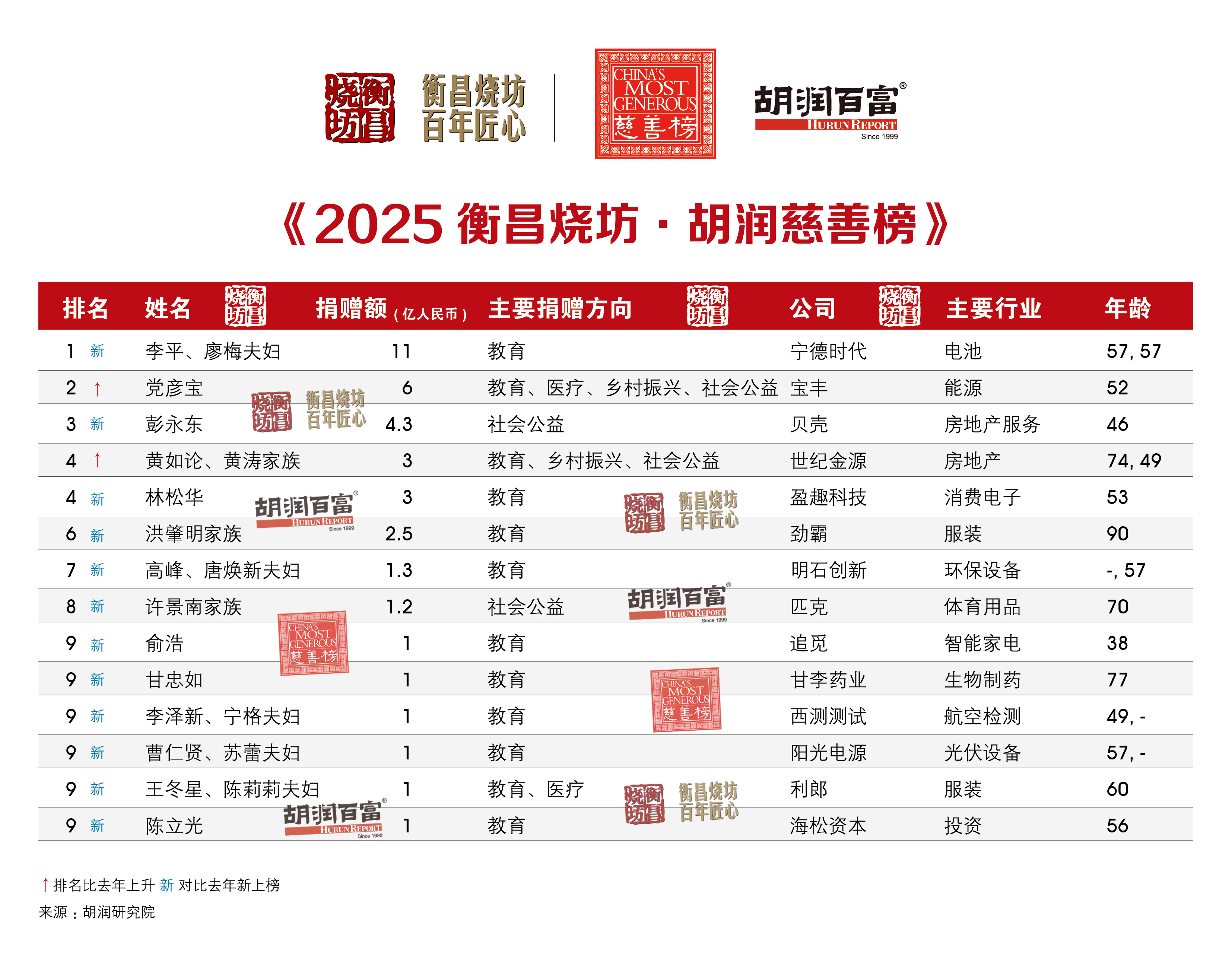 (2025年11月4日,上海)提供有质量的榜单与调研的胡润研究院,携手高端酱香白酒品牌衡昌烧坊,今日联合发布《2025衡昌烧坊·胡润慈善榜》(HENGCHANG SHAOFANG · Hurun China Philanthropy List 2025)。2024年9月1日至2025年8月31日期间的现金和股权捐赠,以及有法律效力的承诺捐赠都统计在内。2025年8月31日至榜单发布日期间的1亿元以上大额捐赠,也计入本次统计。今年是胡润研究院连续第二十二次发布“胡润慈善榜”。
