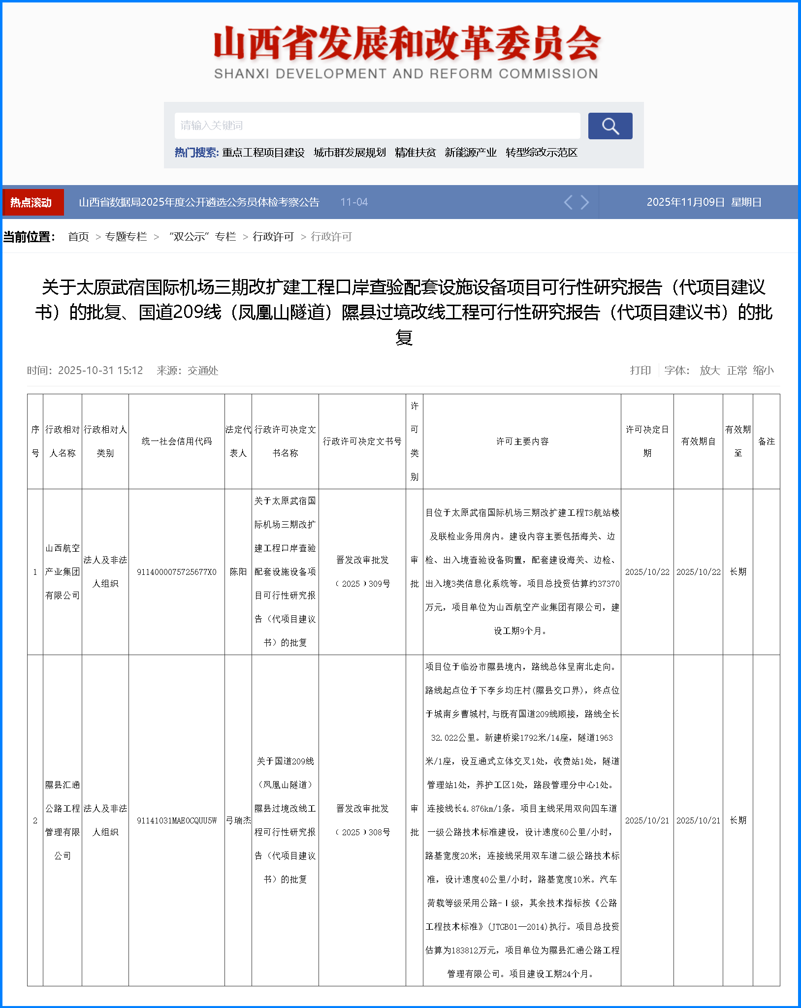 本报太原11月8日讯(记者张剑雯)近日,省发展改革委发布两项交通领域重要批复:太原武宿国际机场三期改扩建工程口岸查验配套设施设备项目、国道209线(凤凰山隧道)隰县过境改线工程可行性研究报告通过审批。两项目总投资合计超22亿元,分别从航空枢纽功能升级与县域公路通行优化两大维度,为我省综合交通运输体系建设注入新动能。