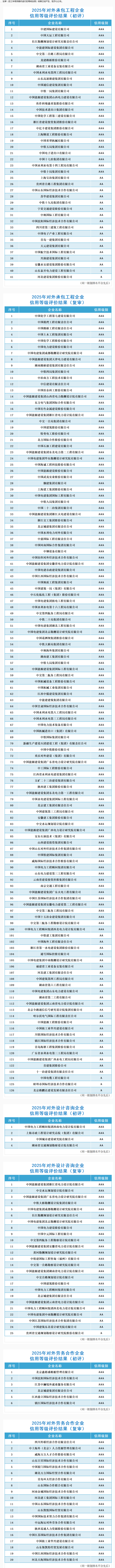 11月13日,2025年中国对外承包工程商会企业信用等级评价结果公布,山西建投通过对外承包工程AAA级信用企业复审(在三年有效期内进行的等级复核),连续八年被评为最高信用等级AAA级企业。