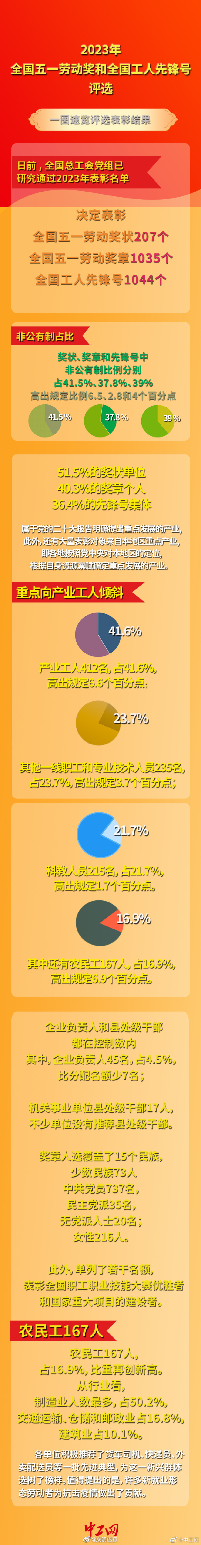 4月27日,2023年庆祝“五一”国际劳动节暨全国五一劳动奖和全国工人先锋号表彰大会在北京人民大会堂隆重举行。大会表彰了全国五一劳动奖状207个、全国五一劳动奖章1035个、全国工人先锋号1044个,其中单列名额的奖状7个、奖章44个、先锋号20个,用于表彰全国职工职业技能大赛优胜者和国家重大项目的建设者。