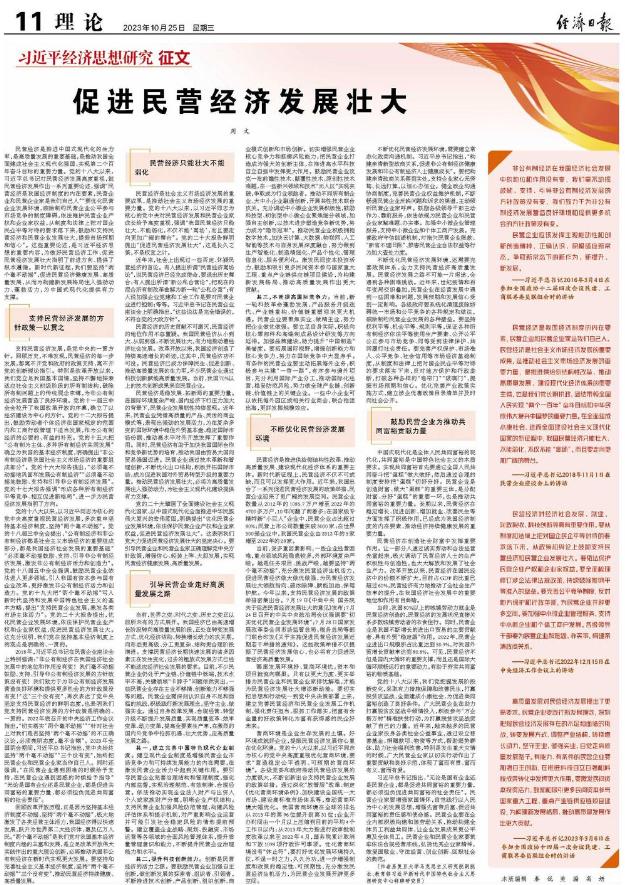 民营经济是社会主义市场经济发展的重要成果,是推动社会主义市场经济发展的重要力量。党的十八大以来,以习近平同志为核心的党中央对民营经济发展和民营企业家成长给予高度重视,强调“我国民营经济只能壮大、不能弱化,不仅不能‘离场’,而且要走向更加广阔的舞台”。党的二十大报告鲜明提出“促进民营经济发展壮大”,这是长久之策,不是权宜之计。