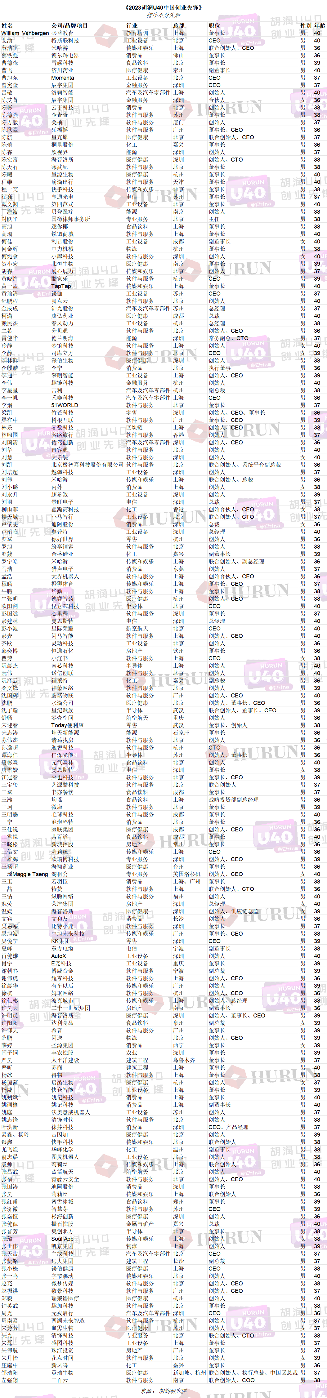 (2023年11月6日,上海)提供全球最大独角兽及未来独角兽榜单的胡润研究院今日发布《2023胡润U40中国创业先锋》(Hurun China Under40s 2023),旨在寻找中国41岁以下的创业先锋。这是胡润研究院首次发布该榜单。