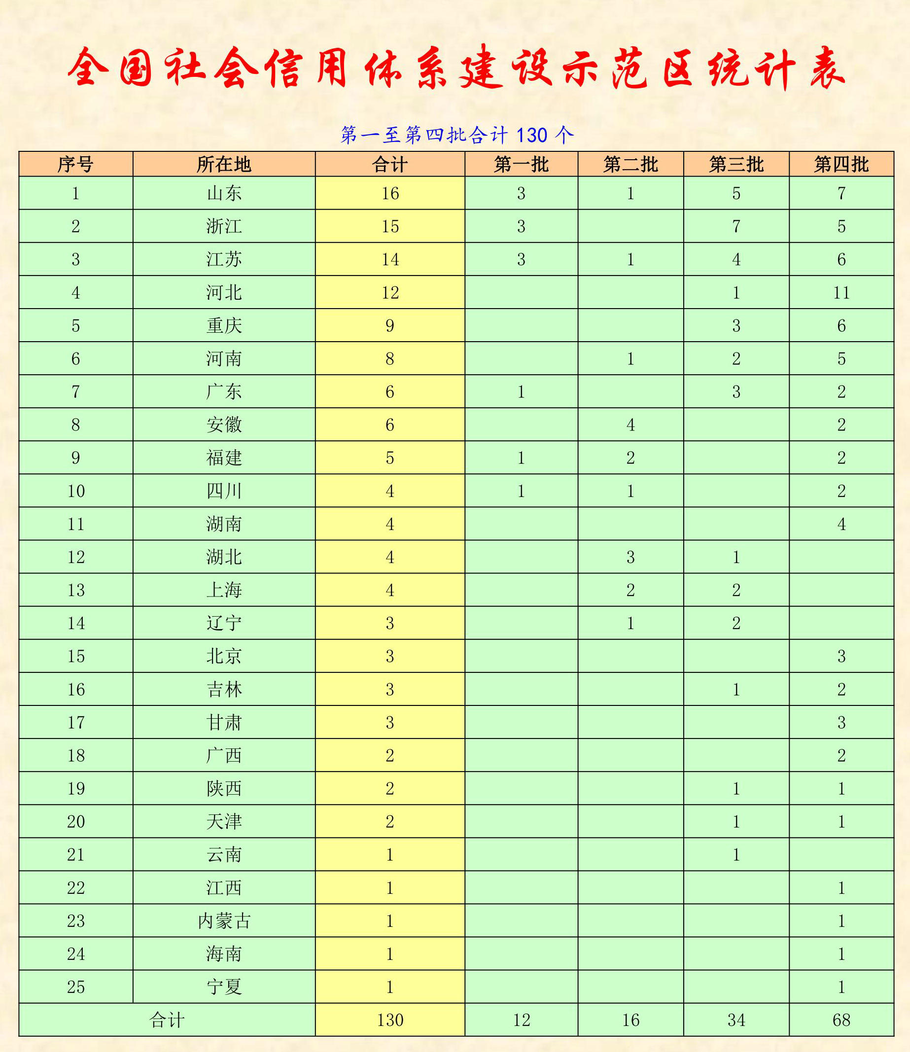 今年8月,国家发展改革委、中国人民银行联合发布了第四批社会信用体系建设示范区名单,68个地区入选。目前,全国共有130个信用示范区,覆盖25个省份。