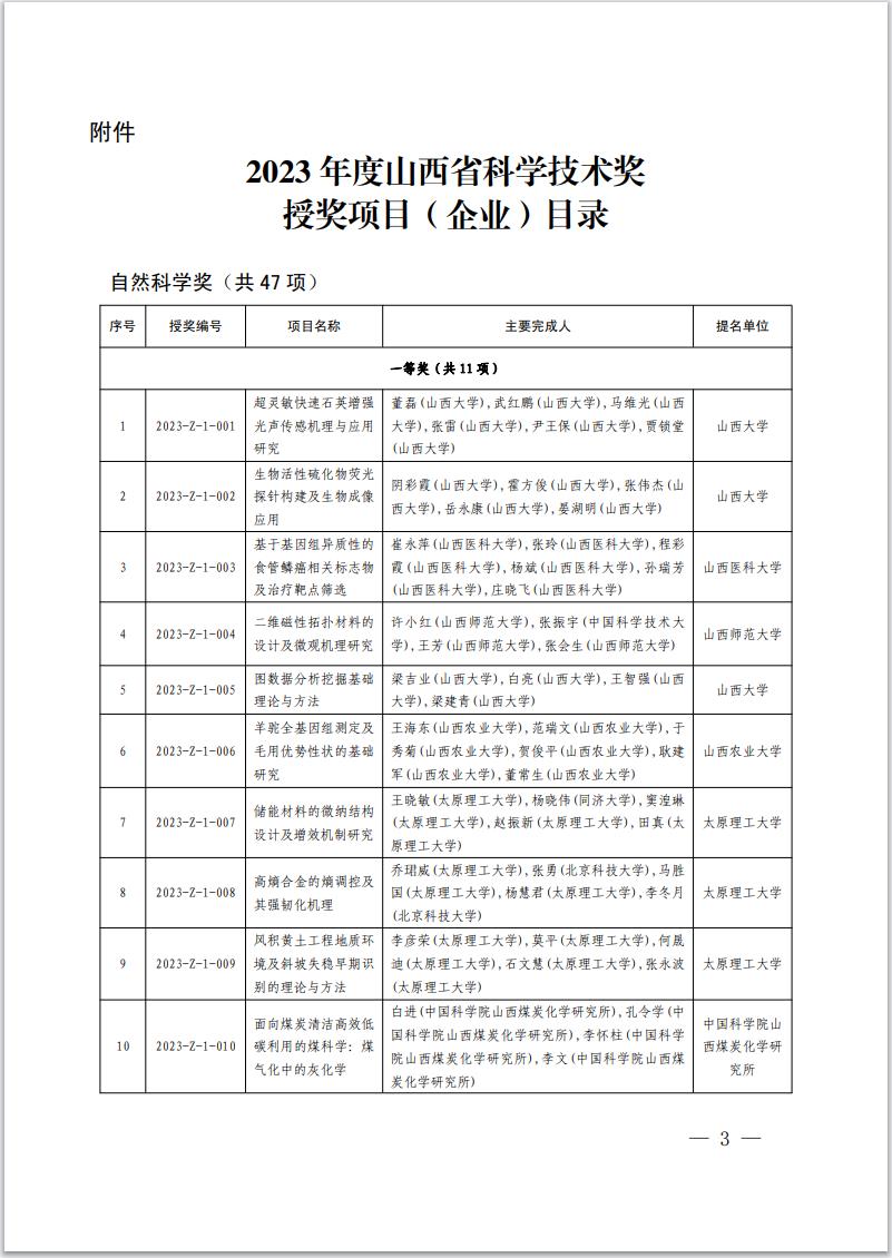 根据《山西省科学技术奖励办法》的规定,经省科学技术奖励评审委员会评审、省科学技术奖励委员会审定,省政府批准,授予“非经典光源制备关键技术及应用”和“煤基固废中锂铝战略资源高值利用的关键技术及应用”2个项目特等奖,授予“超灵敏快速石英增强光声传感机理与应用研究”等35个项目一等奖,授予“剪切/振动耦合超常动态凝固理论与方法”等158个项目二等奖,授予“山西航天清华装备有限责任公司”等6家单位企业技术创新奖。