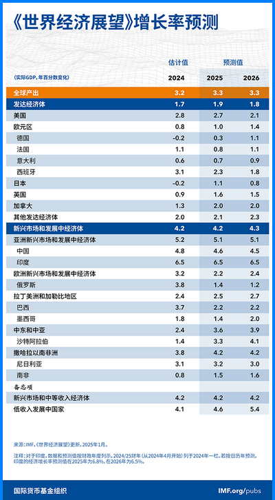 2025年和2026年,全球经济增速预计均为3.3%,低于3.7%的历史平均水平(2000年至2019年)。2025年的预测值与2024年10月《世界经济展望》的预测基本持平,这主要是因为美国增速的上调抵消了其他主要经济体增速的下调。全球的总体通胀率预计将在2025年下降至4.2%,到2026年下降至3.5%。与新兴市场和发展中经济体相比,发达经济体的总体通胀将更早回归至目标水平。