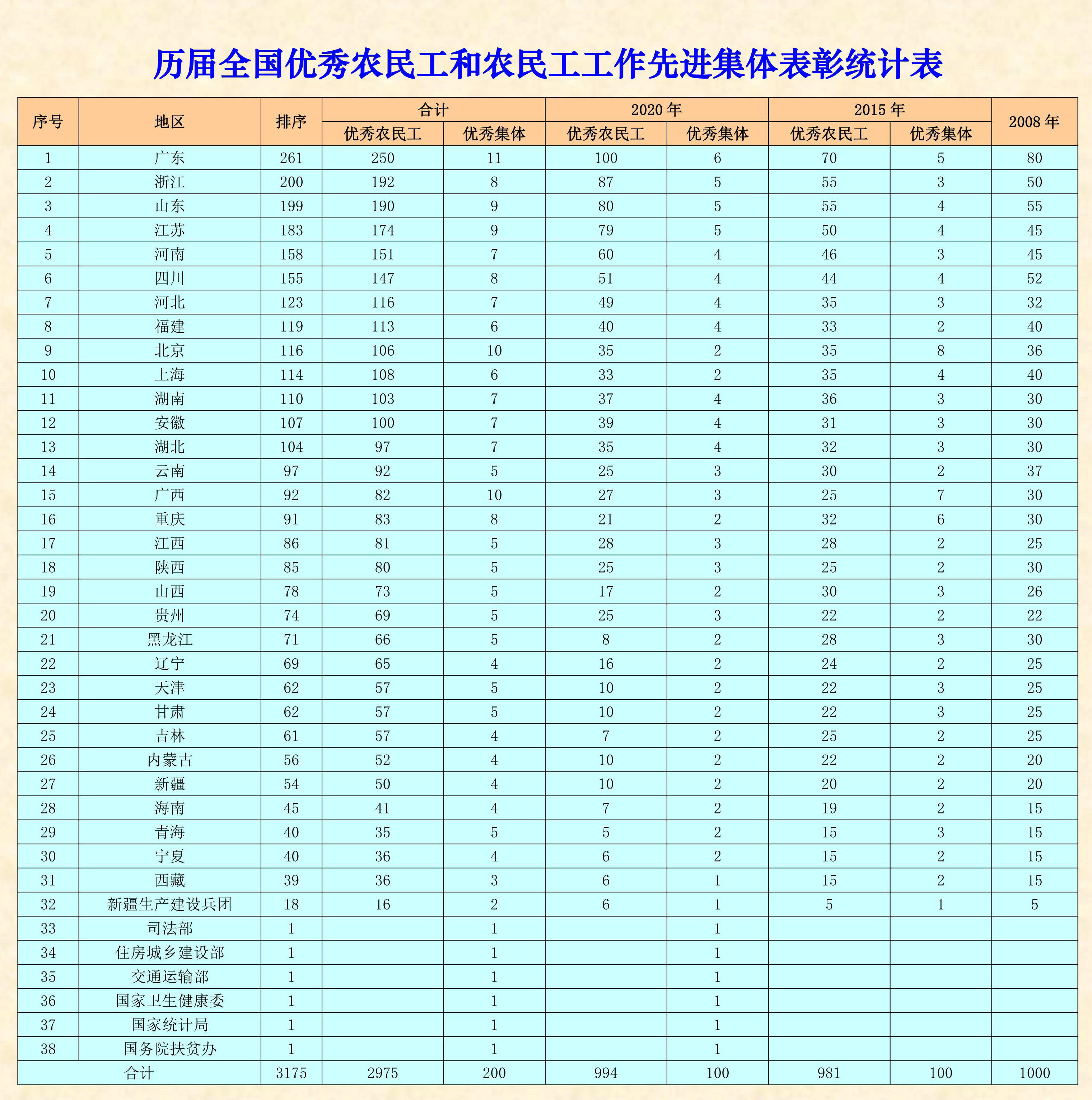 历届表彰全国优秀农民工和农民工工作先进集体名单