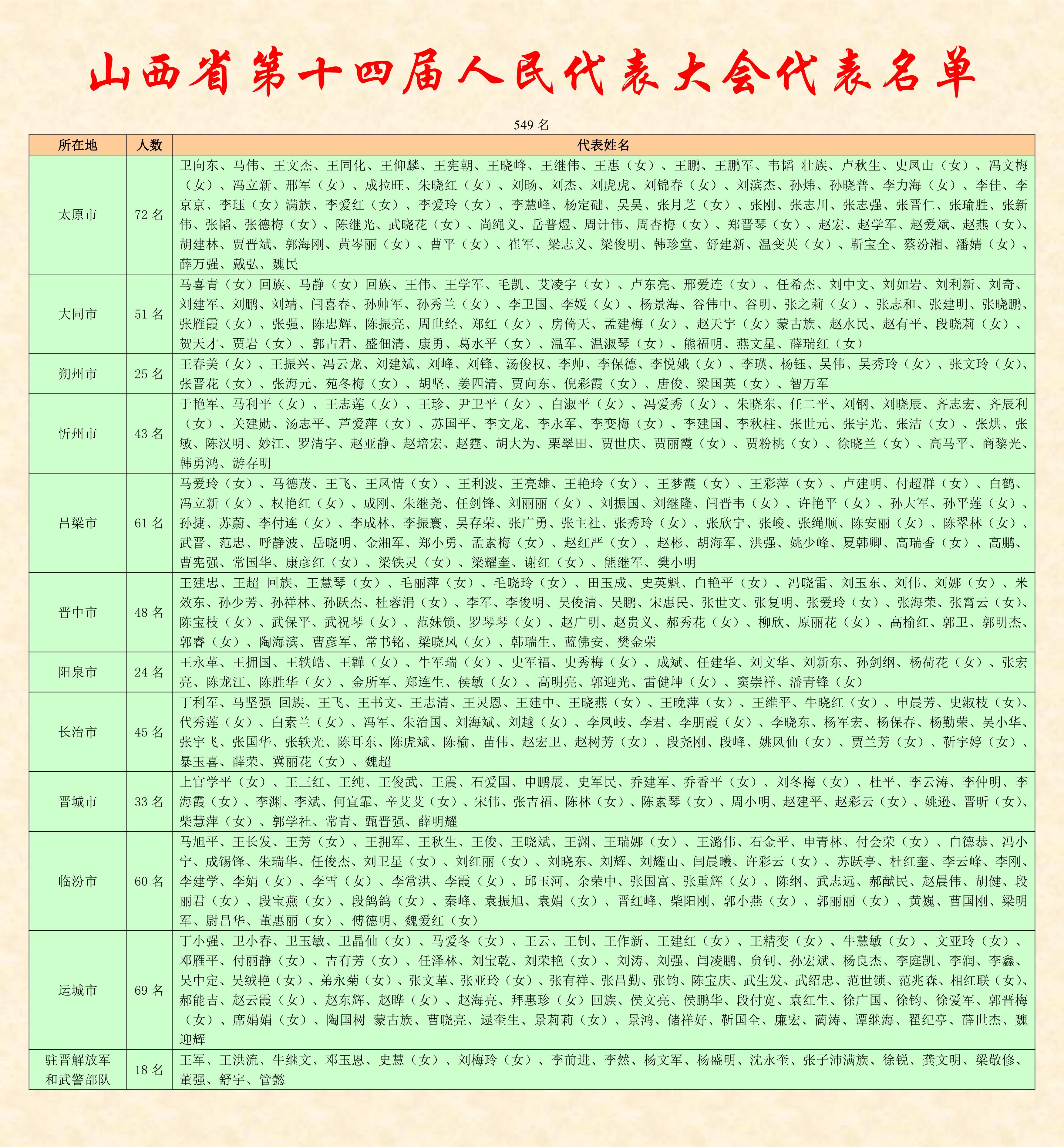 山西省第十四届人民代表大会代表名单和中国人民政治协商会议第十三届山西省委员会委员名单(各549名)