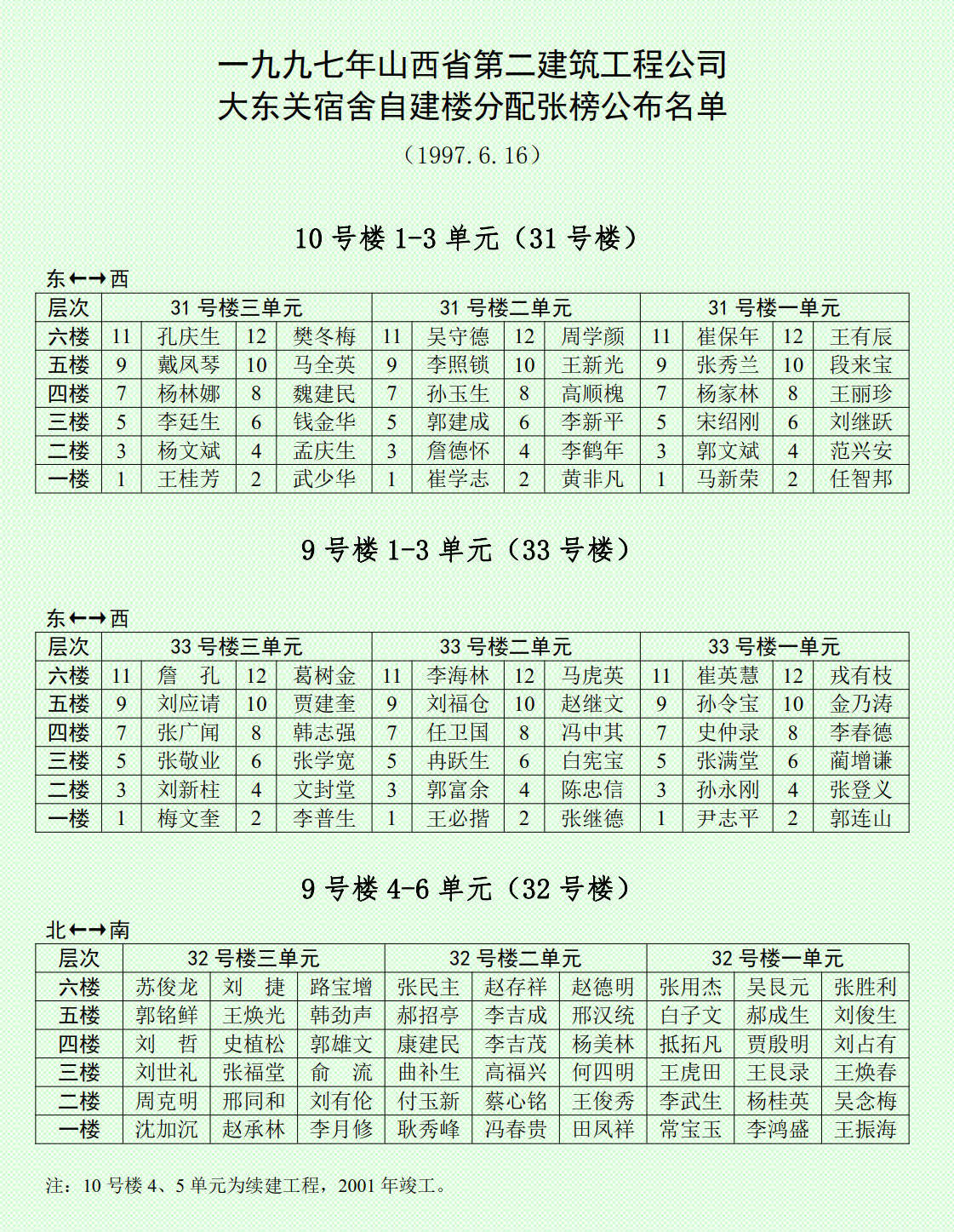 回到主题,下面是省建二公司上世纪末,最后一次福利分房,当时每平米价格是408元。找到山西二建、山西四建的资料后,捎带看到这份分房榜。一下子又把我带回1997年,那次张榜公布最后定案的名单。那时候,这可是公司所有职工盼望已久,翘首以待的结果,真是有人欢喜有人愁啊!看到了吗,我分到的房子,可以说是上上等,无论从位置、层次、光照、朝向看,都无话可说,那是上上下下几千人都日思夜想的愿望啊!之前,我并没有因为个人利益找过任何公司领导,倒是主管分房的领导专门到科里征求我的意见,看上哪套要哪套,其他人不征求个人意见,只对科长你例外!我携了妻子、儿子去自建楼实地考察。六层砖混结构楼,按说三层为佳,可是由于楼间距问题,四层光照更好一些,这对妻子的关节炎有好处。一家人充分协商,最后确定了中间单元四层左户。回公司,也就打个电话告知分房领导。现在回想起来,当时确实欠妥,看把你了不得的,你的架子也忒大了吧!连一句感谢的话都舍不得说,别人把分房领导的门都踏破了,使出浑身解数,哭的、闹的、软硬兼施,最后还是不能如愿,甚至记恨一辈子!