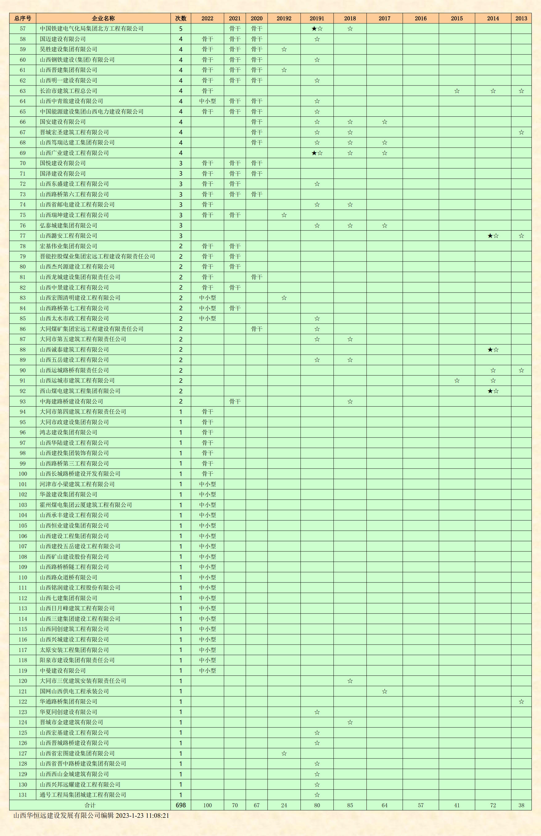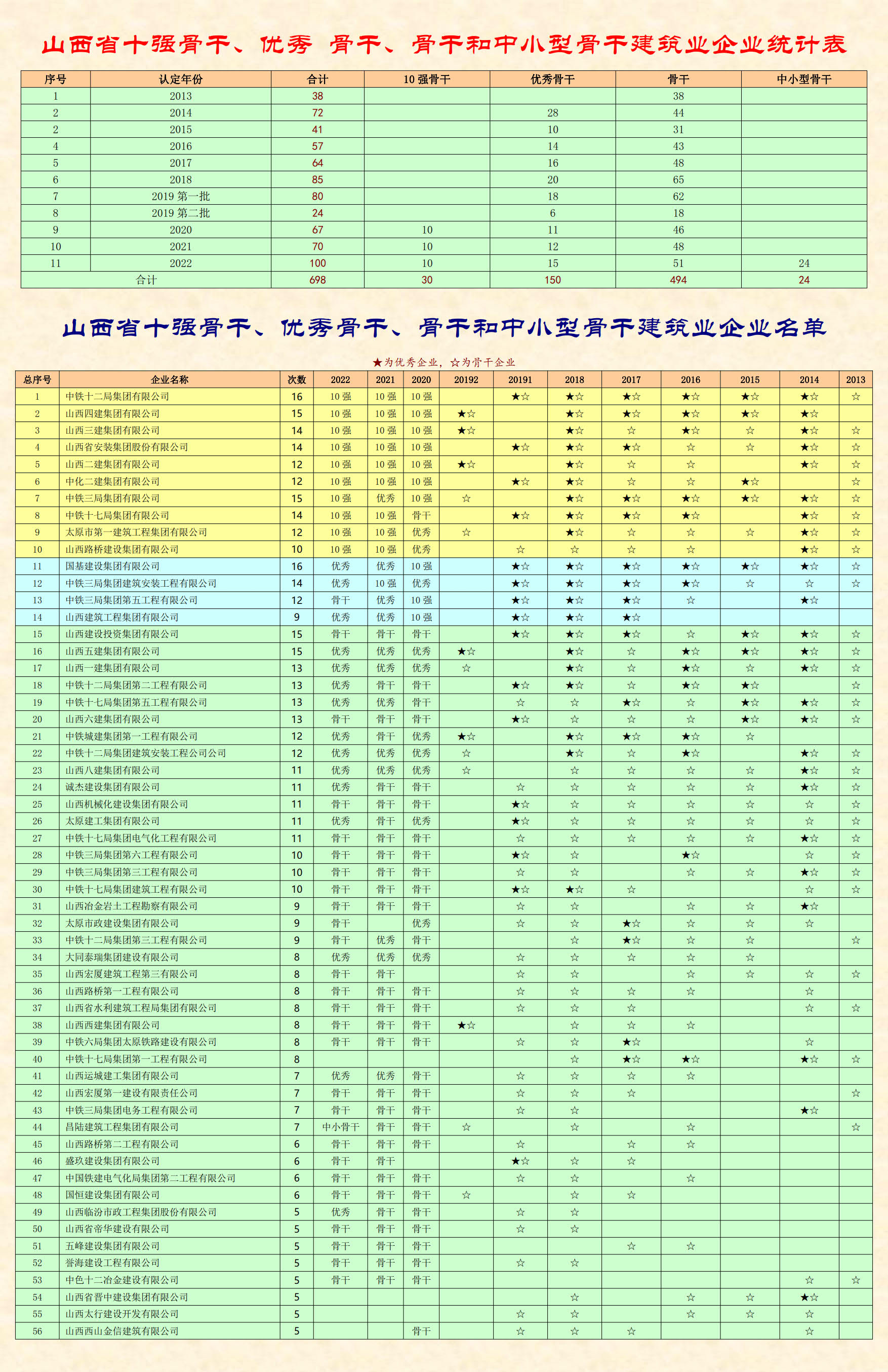 历年山西省骨干、优秀骨干 和10强骨干建筑业企业名单及统计表
