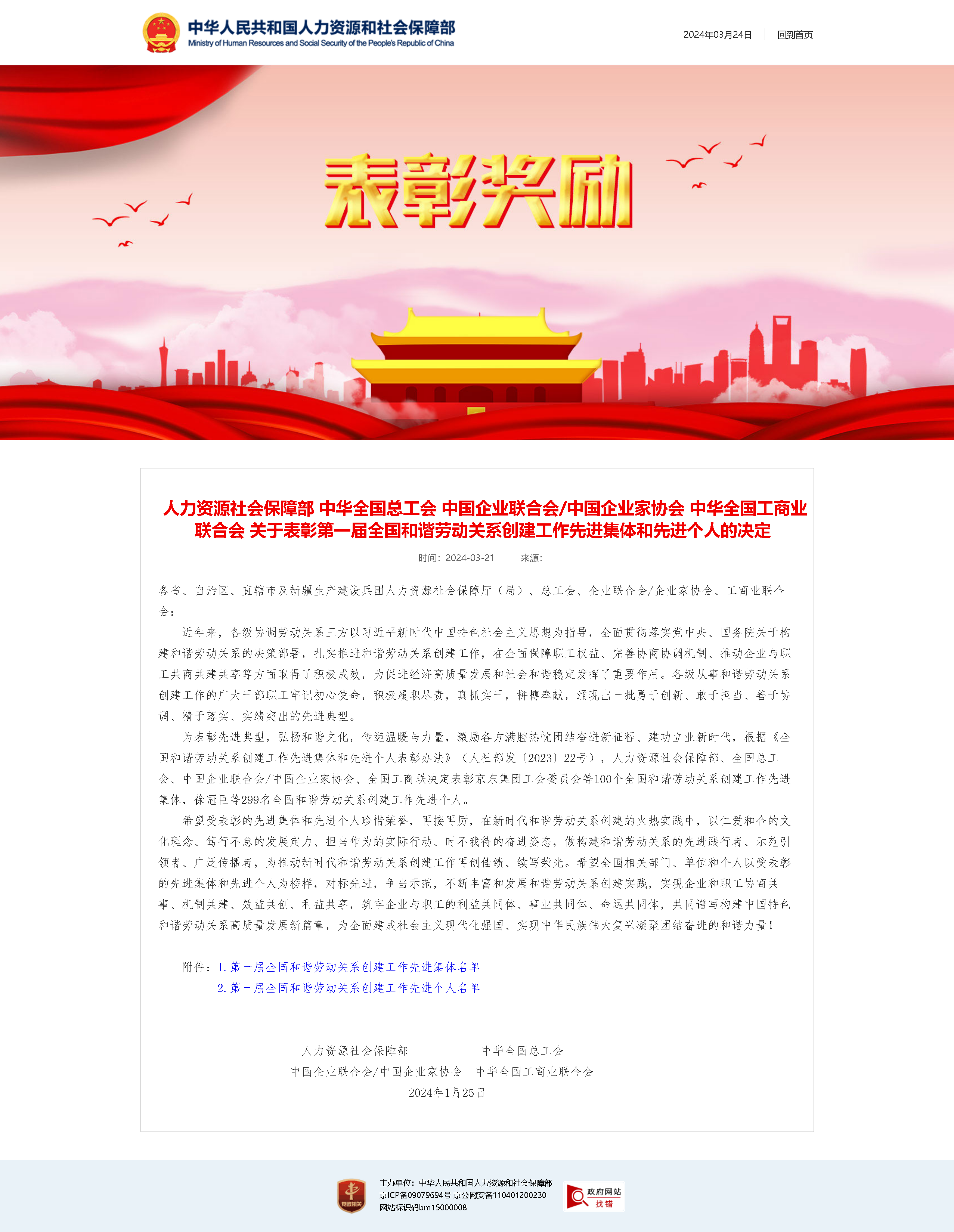 为表彰先进典型,弘扬和谐文化,传递温暖与力量,激励各方满腔热忱团结奋进新征程、建功立业新时代,根据《全国和谐劳动关系创建工作先进集体和先进个人表彰办法》(人社部发〔2023〕22号),人力资源社会保障部、全国总工会、中国企业联合会/中国企业家协会、全国工商联决定表彰京东集团工会委员会等100个全国和谐劳动关系创建工作先进集体,徐冠巨等299名全国和谐劳动关系创建工作先进个人。