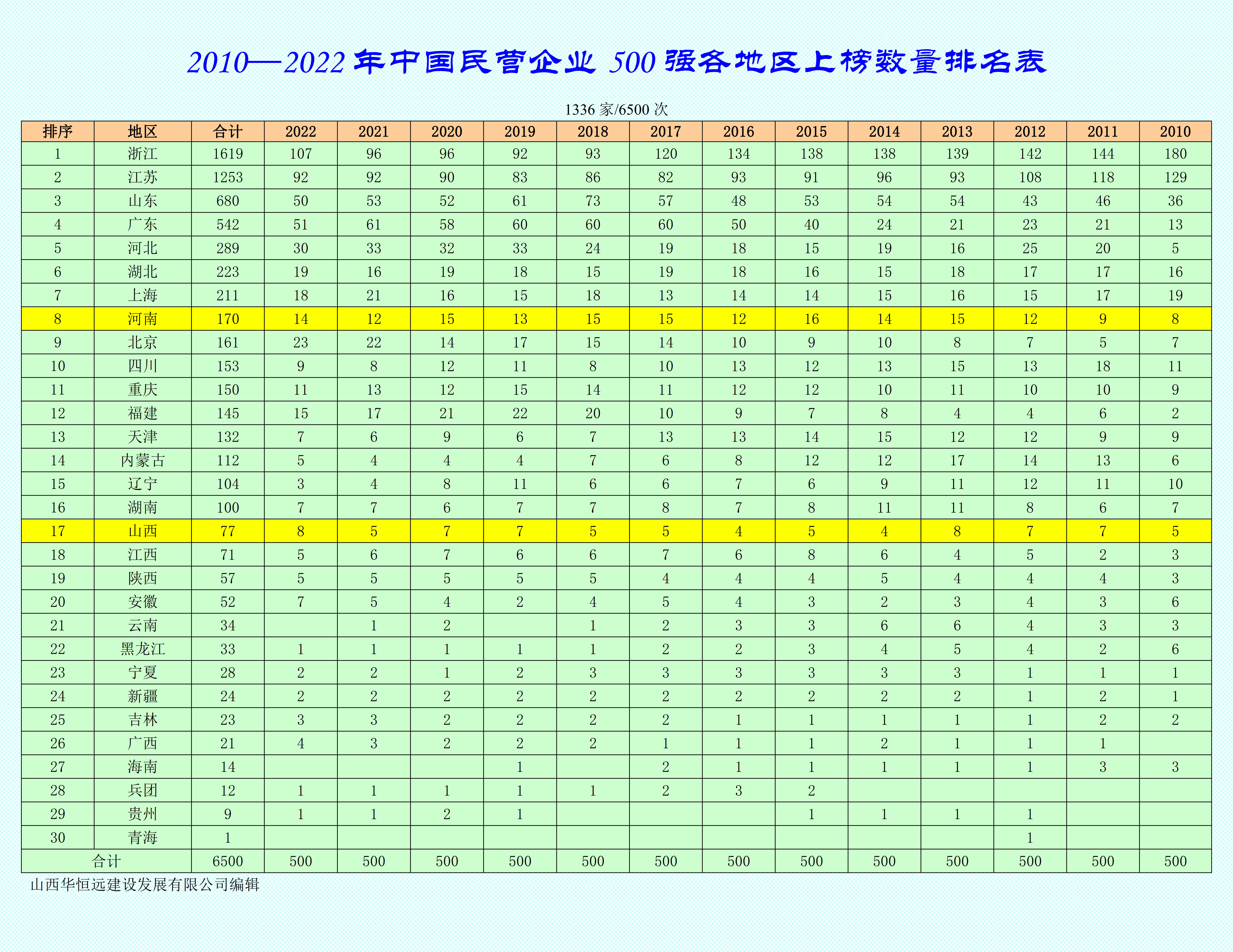 2010-2022 年中国民营企业 500 强入围企业统计表
