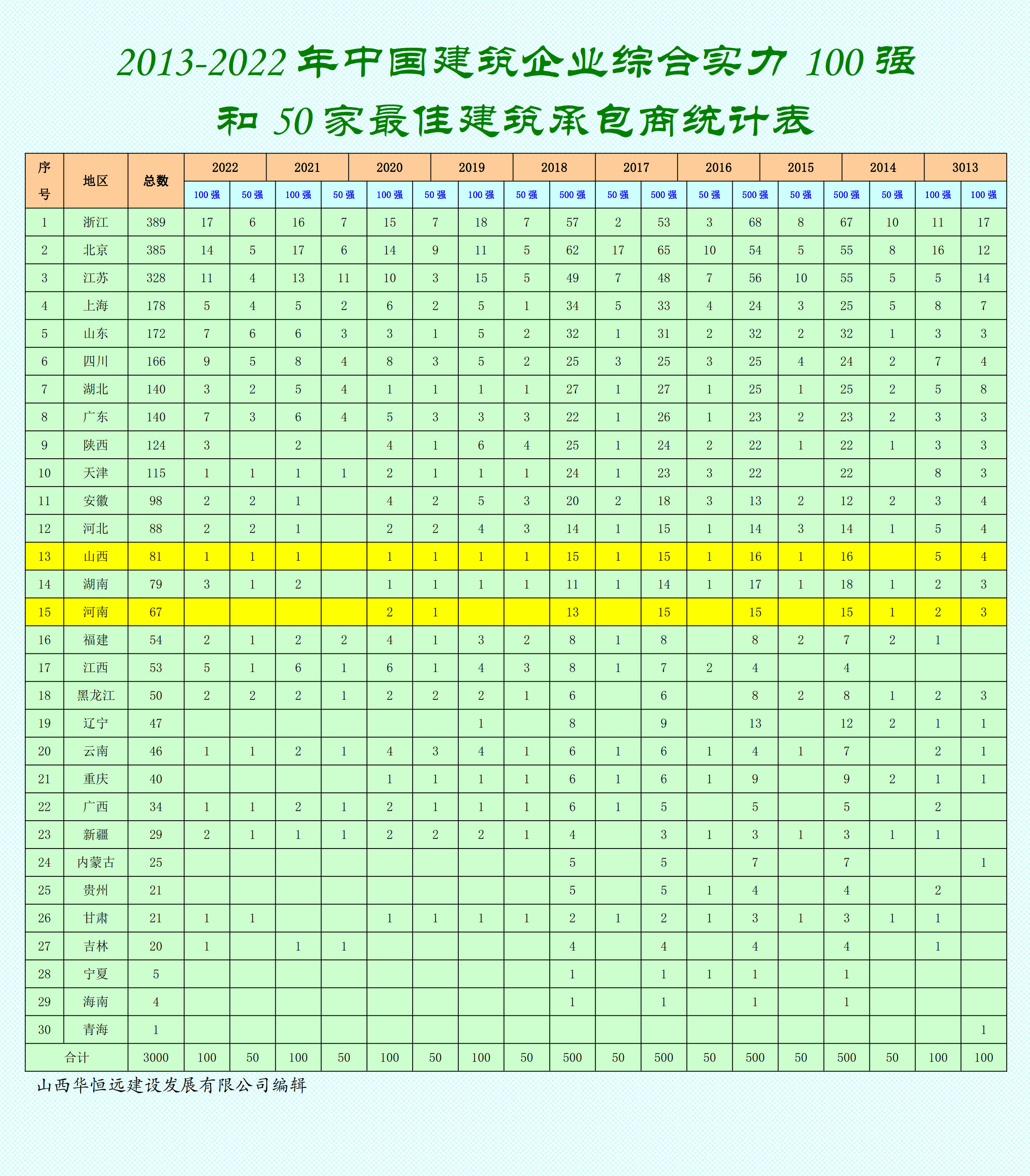 中国建筑企业综合实力100强和中国最佳50家建筑承包商山西榜单