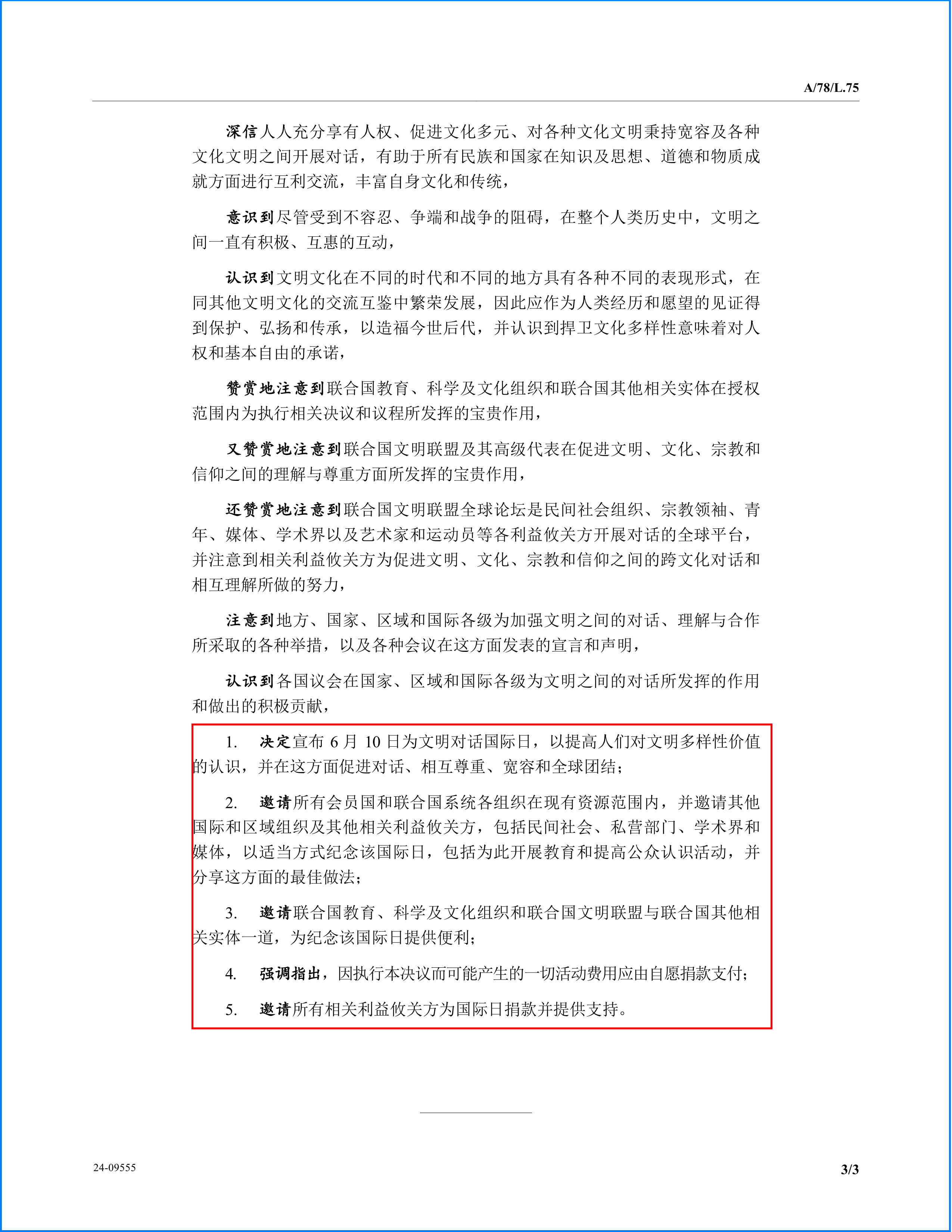 决议邀请所有会员国、国际和区域组织及其他相关利益攸关方以适当方式纪念文明对话国际日,包括开展教育和提高公众认识活动。