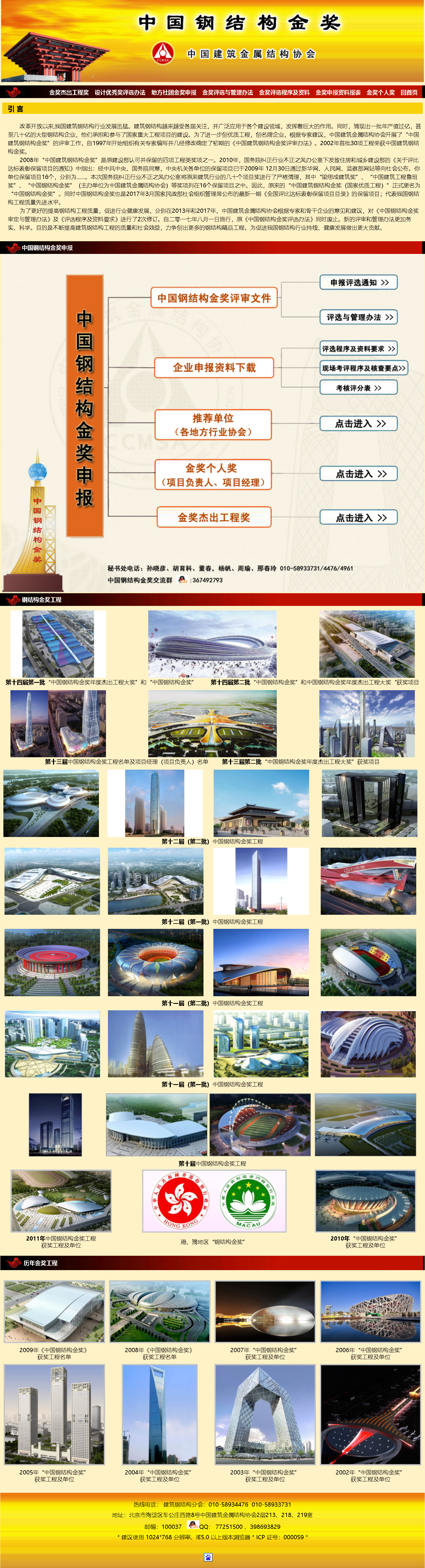 改革开放以来,我国建筑钢结构行业发展迅猛。建筑钢结构越来越受各届关注,并广泛应用于各个建设领域,发挥着巨大的作用。同时,涌现出一批年产值过亿,甚至几十亿的大型钢结构企业,他们承担和参与了国家重大工程项目的建设。为了进一步创优质工程,创名牌企业,根据专家建议,中国建筑金属结构协会开展了“中国建筑钢结构金奖”的评审工作,自1997年开始组织有关专家编写并几经修改确定了初期的《中国建筑钢结构金奖评审办法》。2002年首批30项工程荣获中国建筑钢结构金奖。