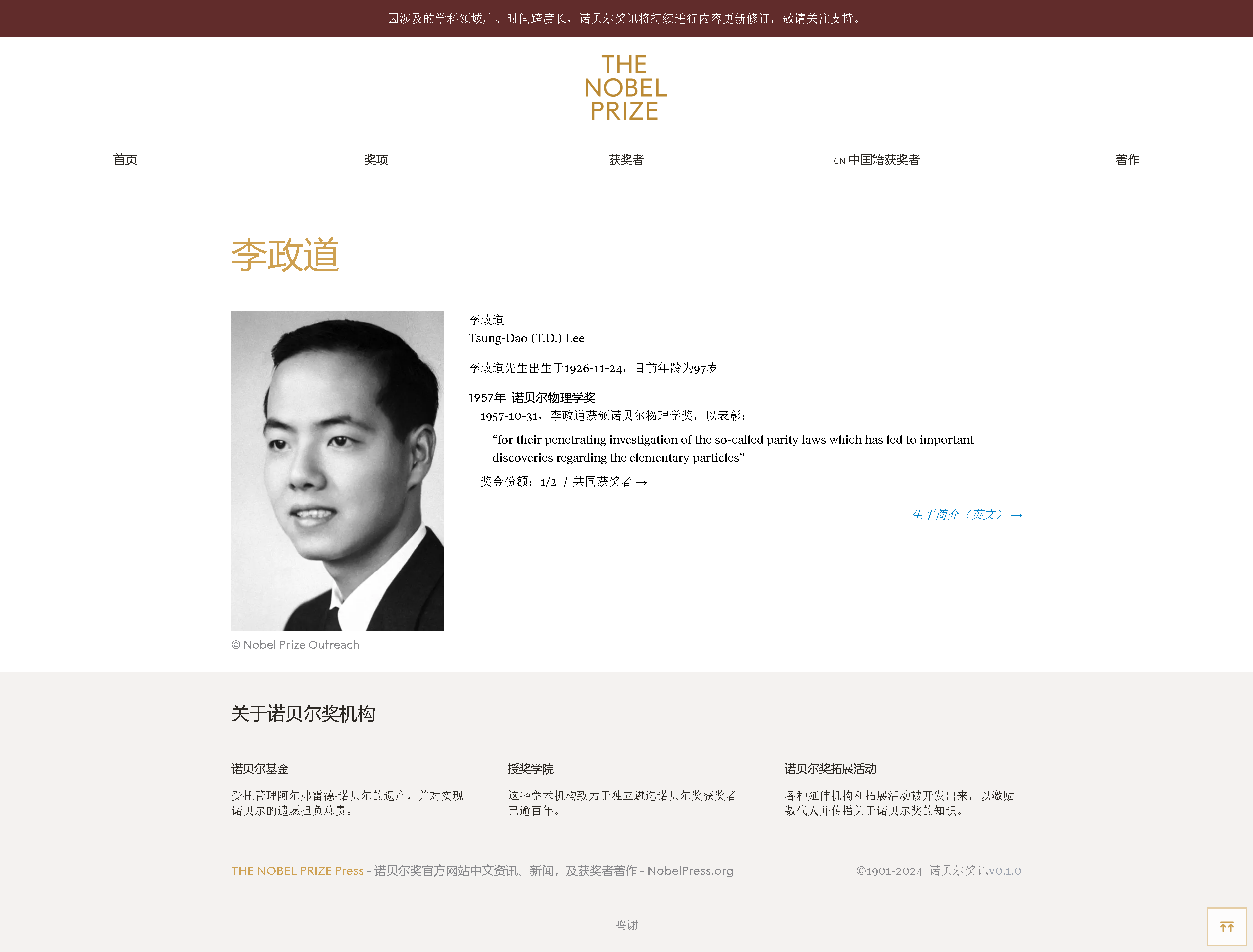 讣告介绍,作为开创华人获得诺贝尔奖历史的物理大师之一,李政道先生在六十余年的学术生涯中严谨治学,在量子场论、基本粒子理论、核物理、统计力学、流体力学、天体物理等诸多领域,力寻突破,不断攀登科学高峰,求实求真,为物理学的发展做出了持久而明确的贡献。