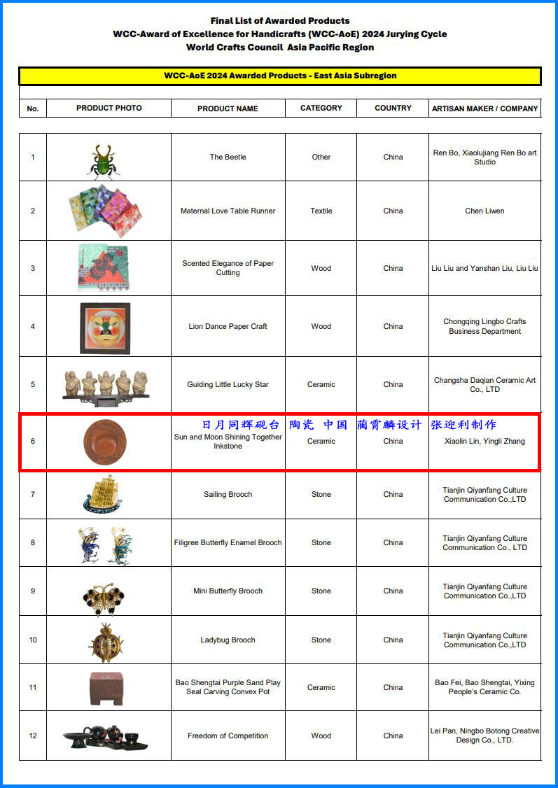 “世界杰出手工艺品徽章”是世界手工艺行业的最高荣誉。“日月同辉砚”的设计者蔺霄麟是国家级非遗绛州澄泥砚第三代传承人(市级)、中国文房四宝行业青年之星、山西省陶瓷艺术大师、运城市工艺美术大师;张迎利则为国家级非遗绛州澄泥砚传承人、澄泥砚雕刻技术能手。