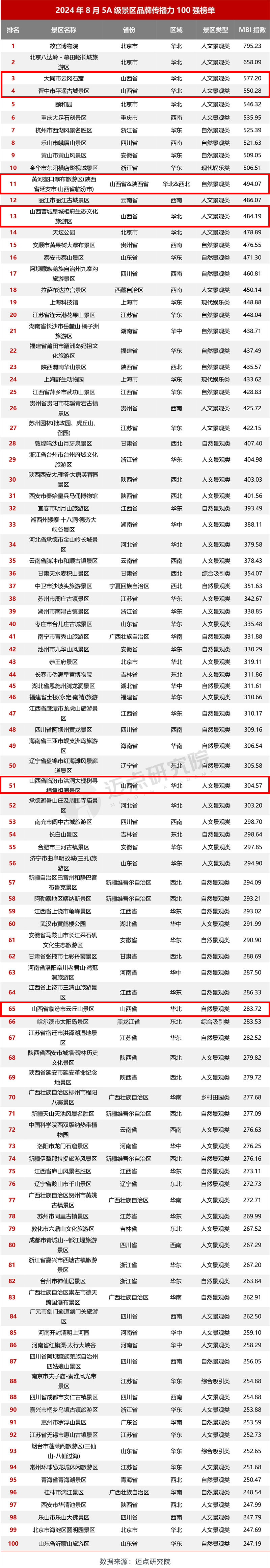 【综合信息】2024年8月5A级景区品牌传播力100强榜单