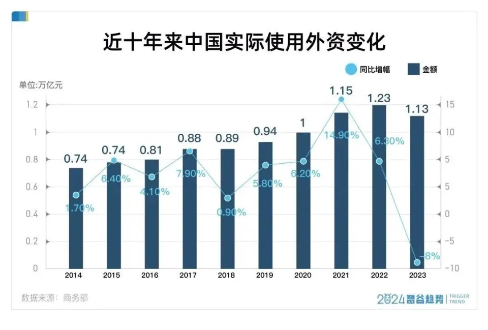 2023年,我国的外商投资出现了近十年来的首次下降,降幅约为8%。