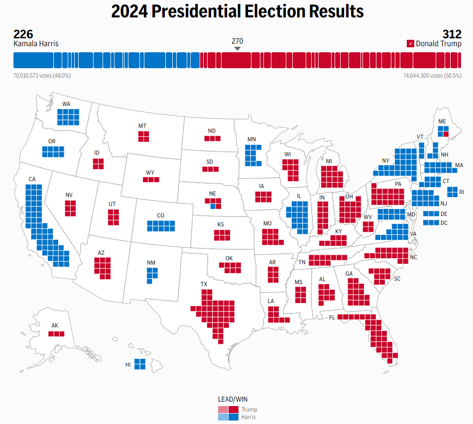根据美国国家广播公司的测算,目前美国各州的普选结果均已出炉,特朗普获得74519466张普选选票,总计获得312张选举人票;民主党总统候选人哈里斯获得70833032张普选选票,总计获得226张选举人票。