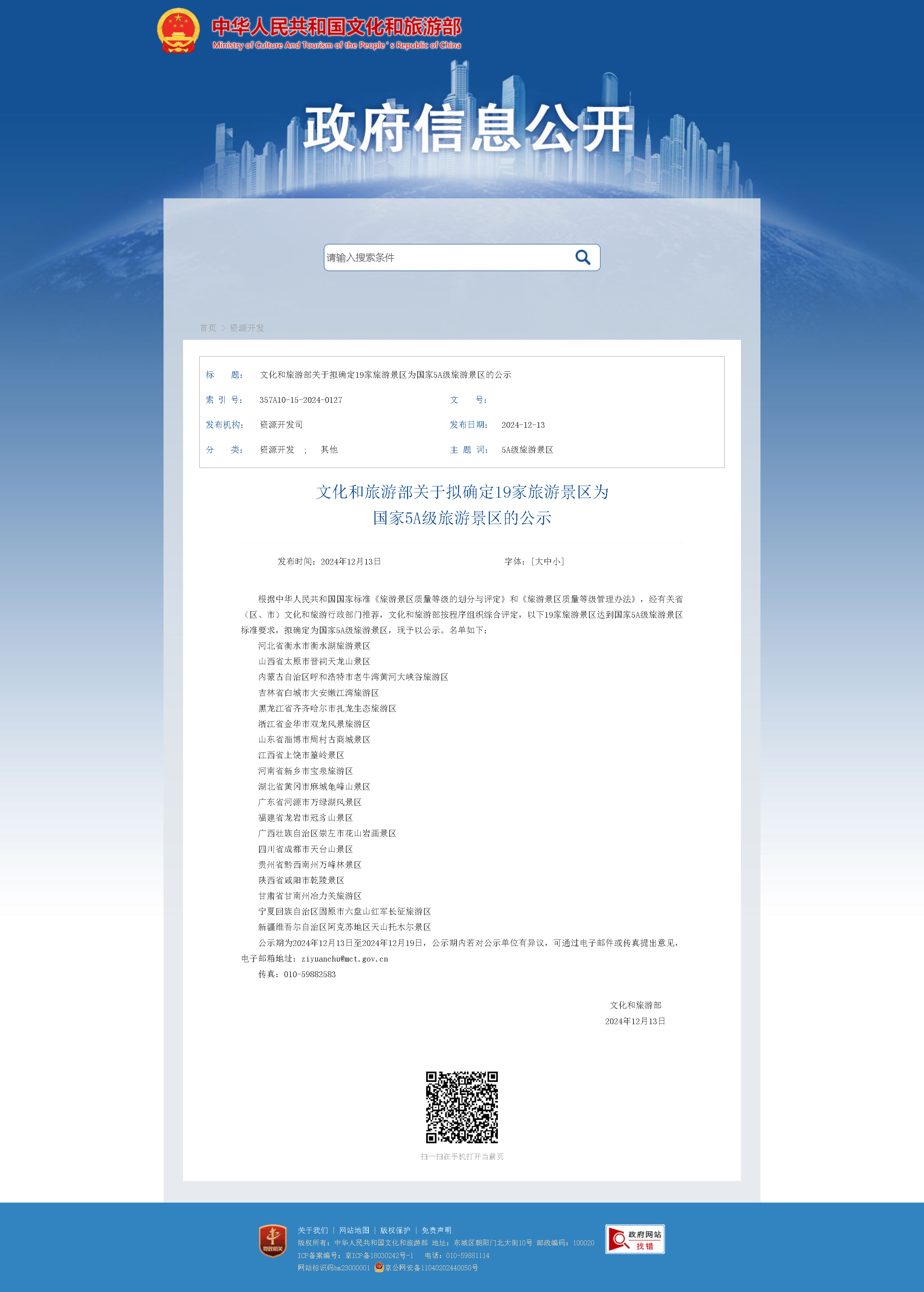 文旅部网站12月13日消息,文化和旅游部发布关于拟确定19家旅游景区为国家5A级旅游景区的公示: