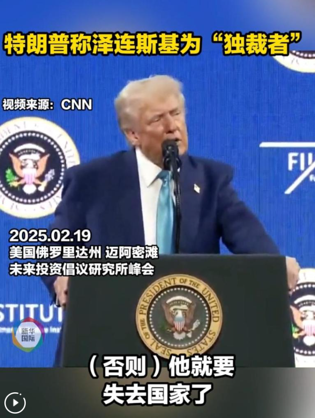 美国总统特朗普19日在佛罗里达州一场会议上说,乌克兰总统泽连斯基是 “独裁者”。他警告说,泽连斯基必须迅速采取行动以实现和平,否则将面临失去国家的风险。